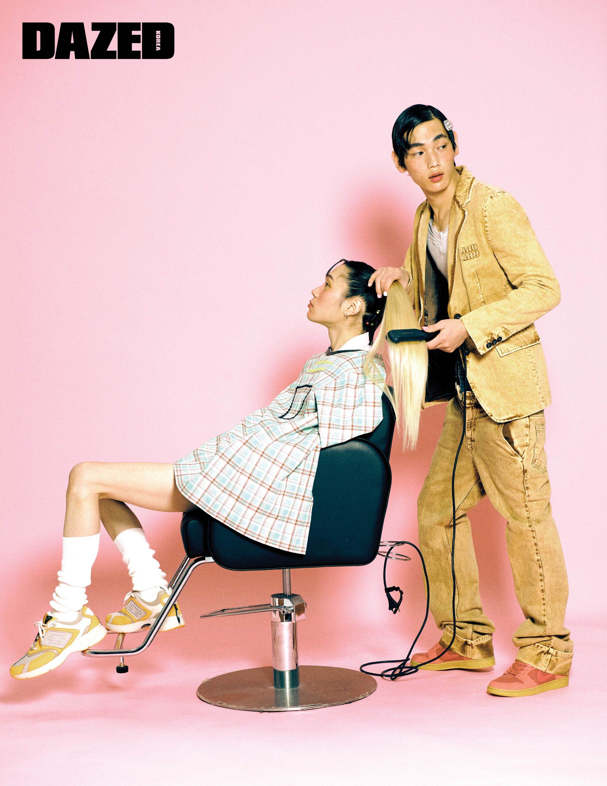 병만이 입은 체크 패턴의 톱은 프라다(Prada), 이너로 입은 핑크 칼라 톱은 샵사이다(Shop Cider), 스니커즈는 펜디(Fendi), 레그 워머는 에디터의 것. 현근이 입은 데님 재킷과 팬츠 셋업은 미우미우(Miu Miu), 레이어링한 데님 쇼츠는 리바이스(Levi’s), 핑크 스니커즈는 나이키(Nike), 레이스 슬리브리스 톱과 실버 헤어핀은 에디터의 것.