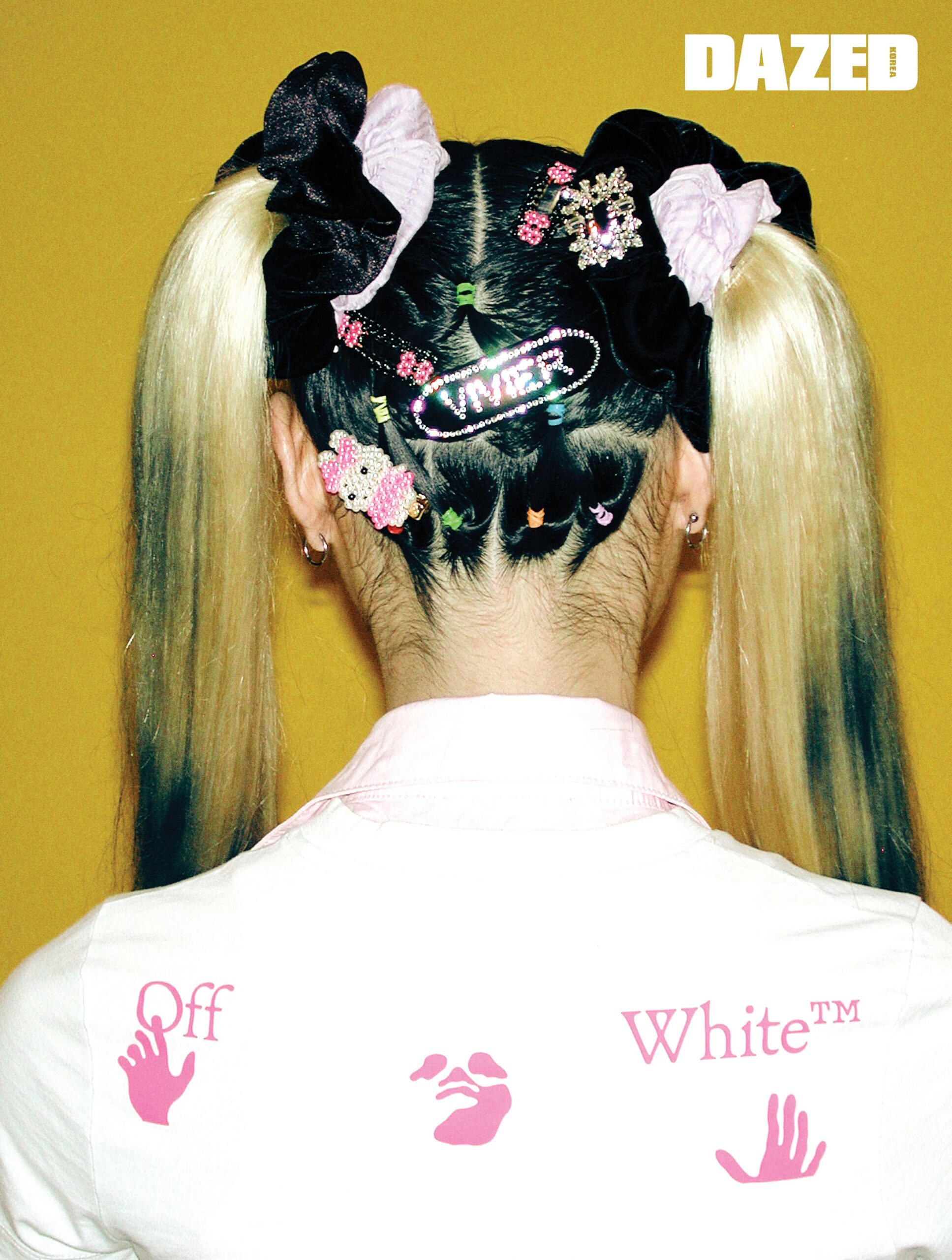크롭트 톱은 오프화이트(Off-White™), 이너로 입은 핑크 칼라 톱은 샵사이다(Shop Cider), 크리스털 장식의 벨벳 스크런치와 로고 헤어핀은 로저 비비에(Roger Vivier), 비즈 래빗 헤어핀과 비즈 리본 헤어핀은 프루타(Fruta), 블랙 스크런치와 퍼플 스크런치는 에디터의 것.
