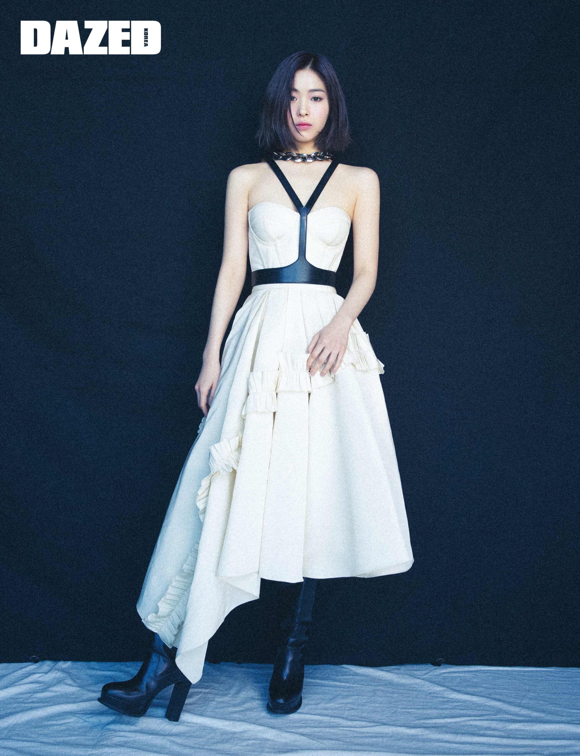 아이보리 원피스, 블랙 레더 롱부츠, 실버 네크리스는 모두 알렉산더 맥퀸(Alexander McQueen).