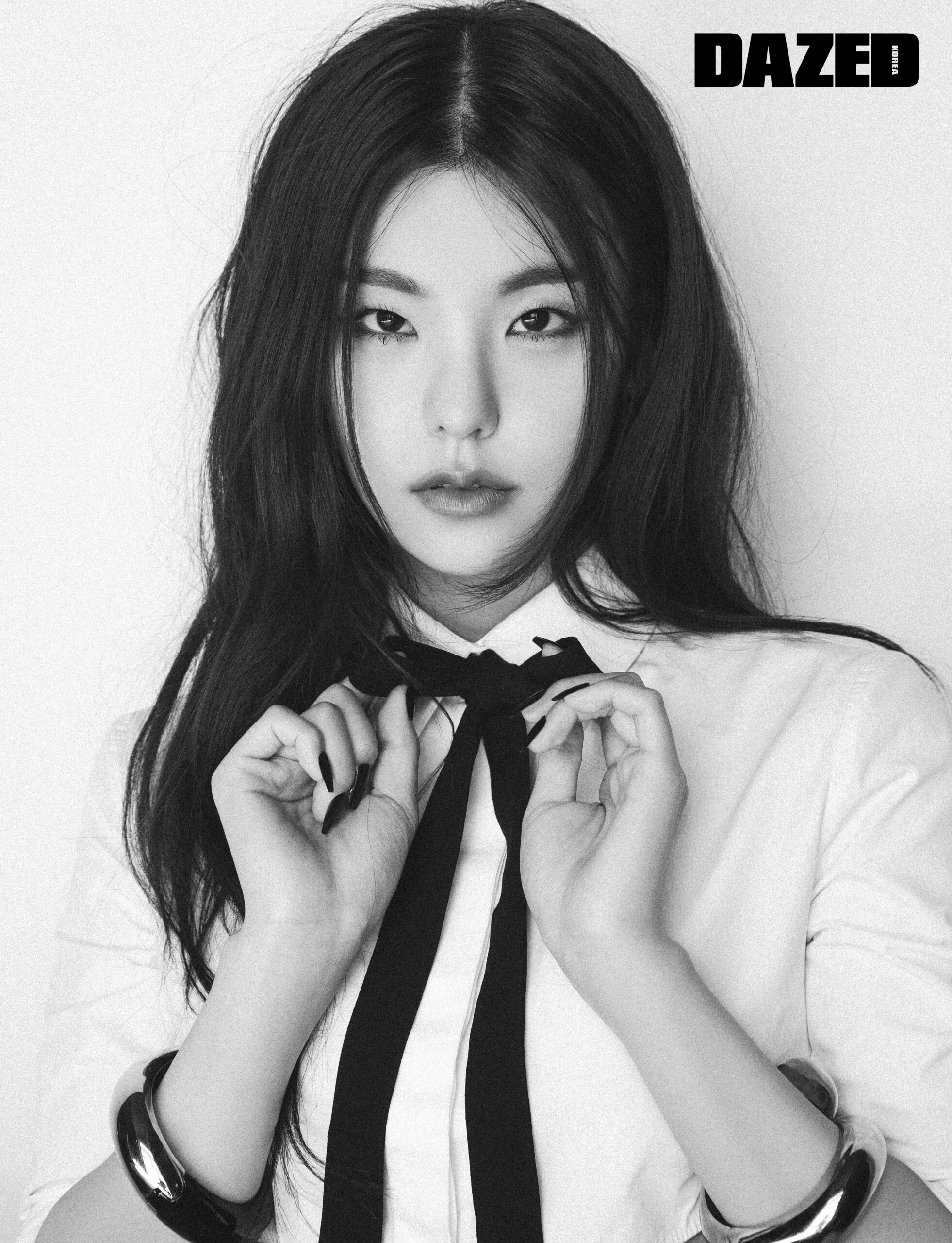 예지가 입은 화이트 크롭트 셔츠와 블랙 롱스커트, 블랙 리본은 모두 발렌티노(Valentino), 실버 브레이슬릿은 알렉산더 맥퀸(Alexander McQueen).