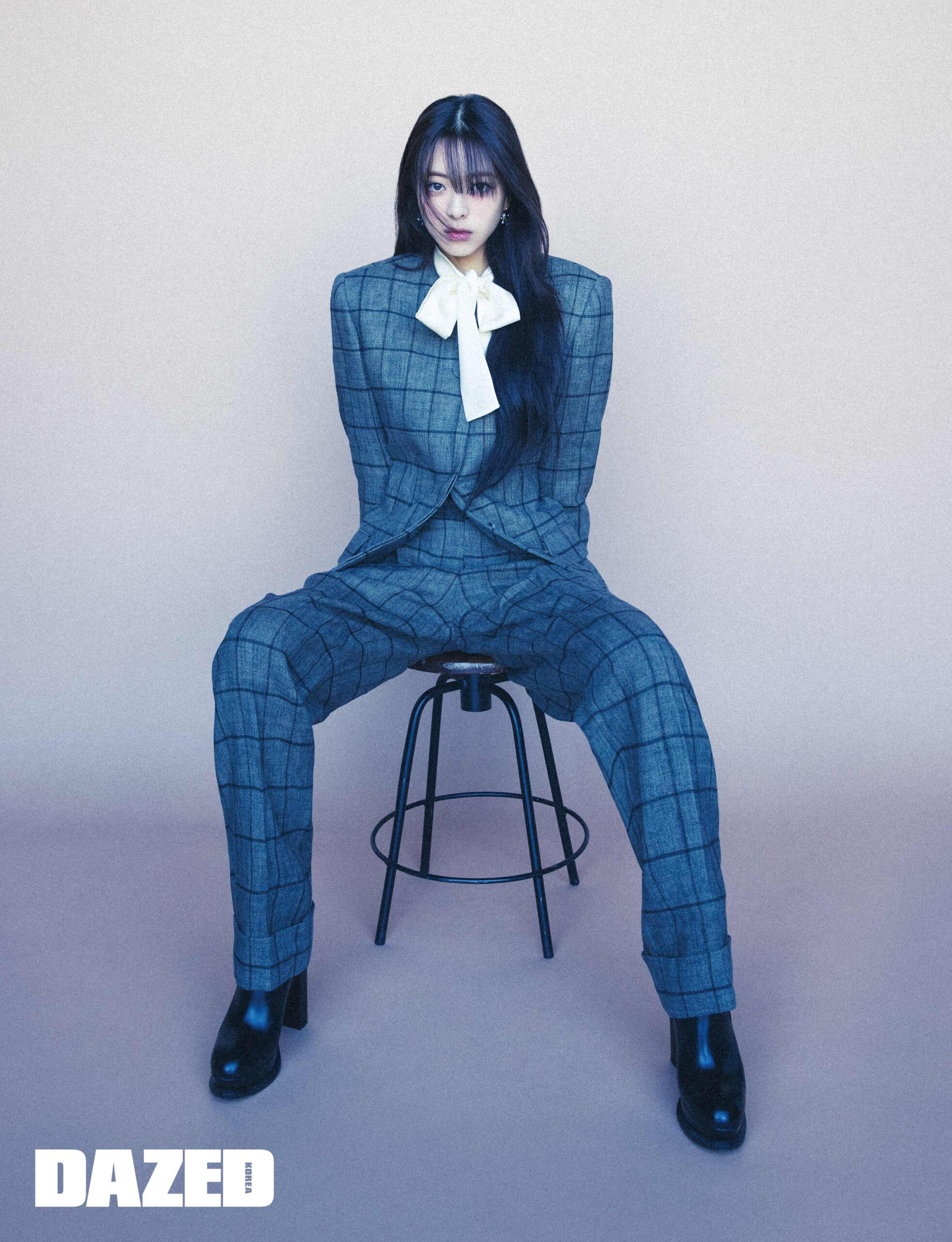 브라운 체크 슈트와 리본 디테일 블라우스는 구찌(Gucci), 블랙 앵클부츠는 알렉산더 맥퀸(Alexander McQueen), 골드 이어링은 타사키(Tasaki).