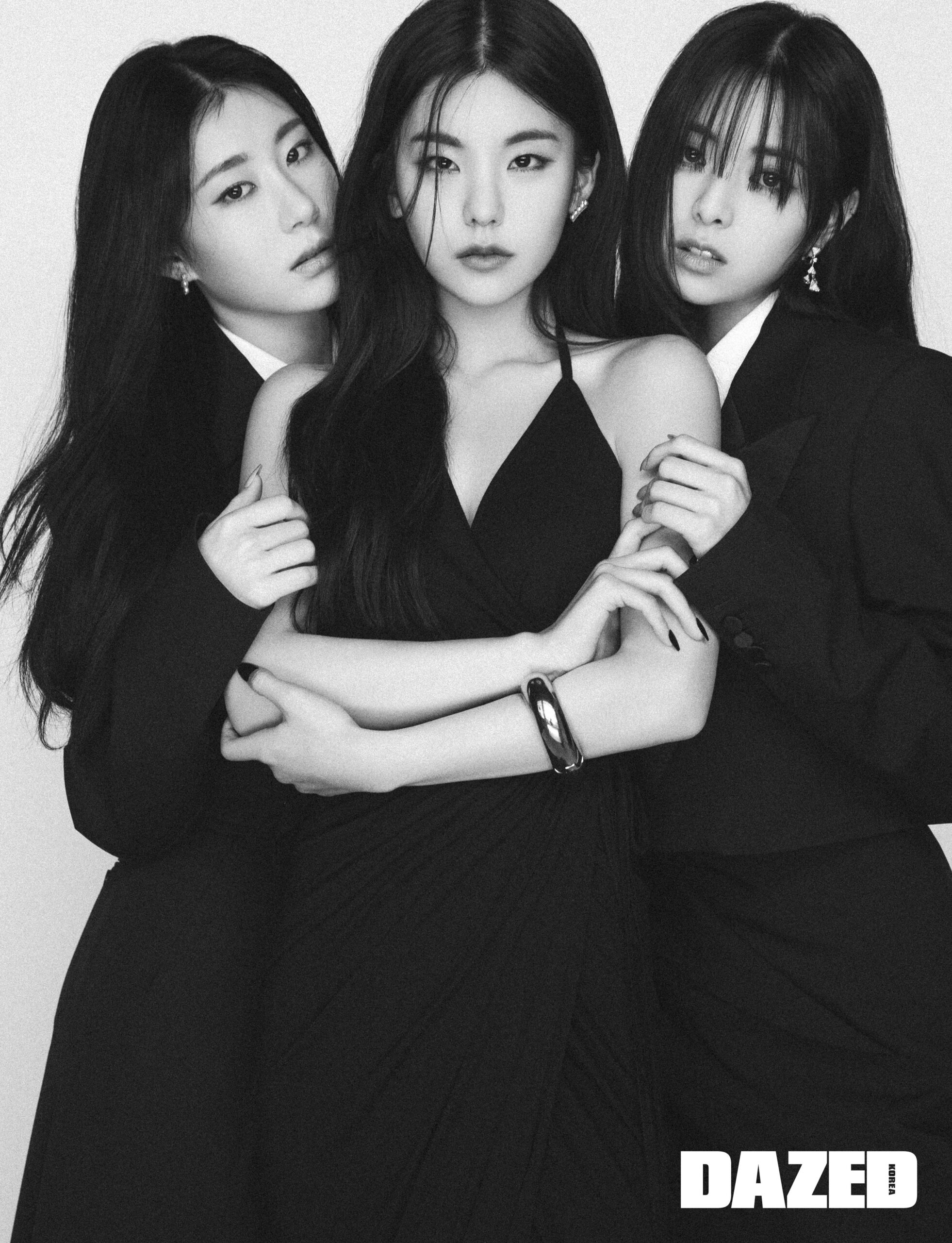 예지가 입은 블랙 홀터넥 원피스는 릭 오웬스(Rick Owens), 실버 브레이슬릿은 알렉산더 맥퀸(Alexander McQueen), 실버 이어링은 타사키(Tasaki).