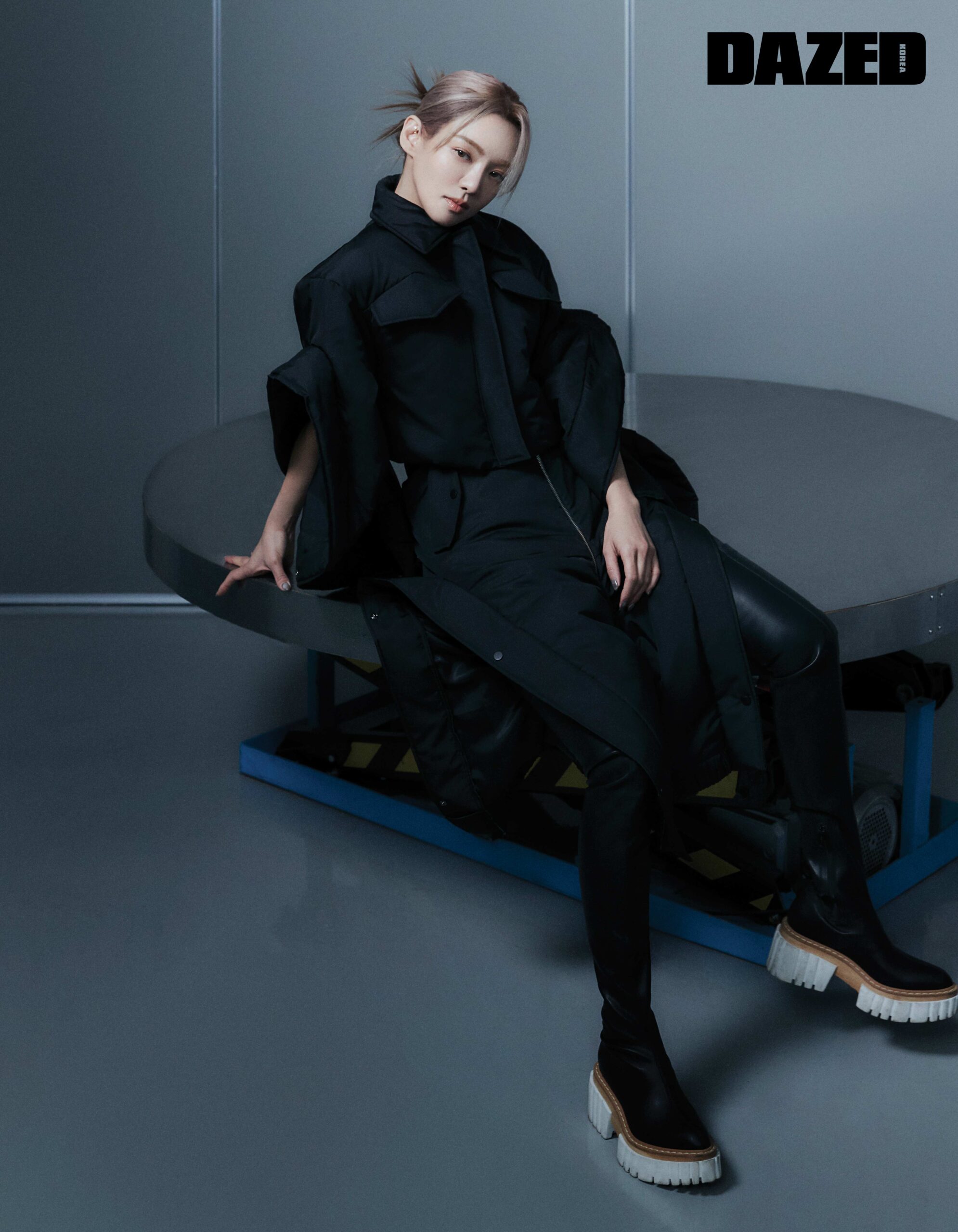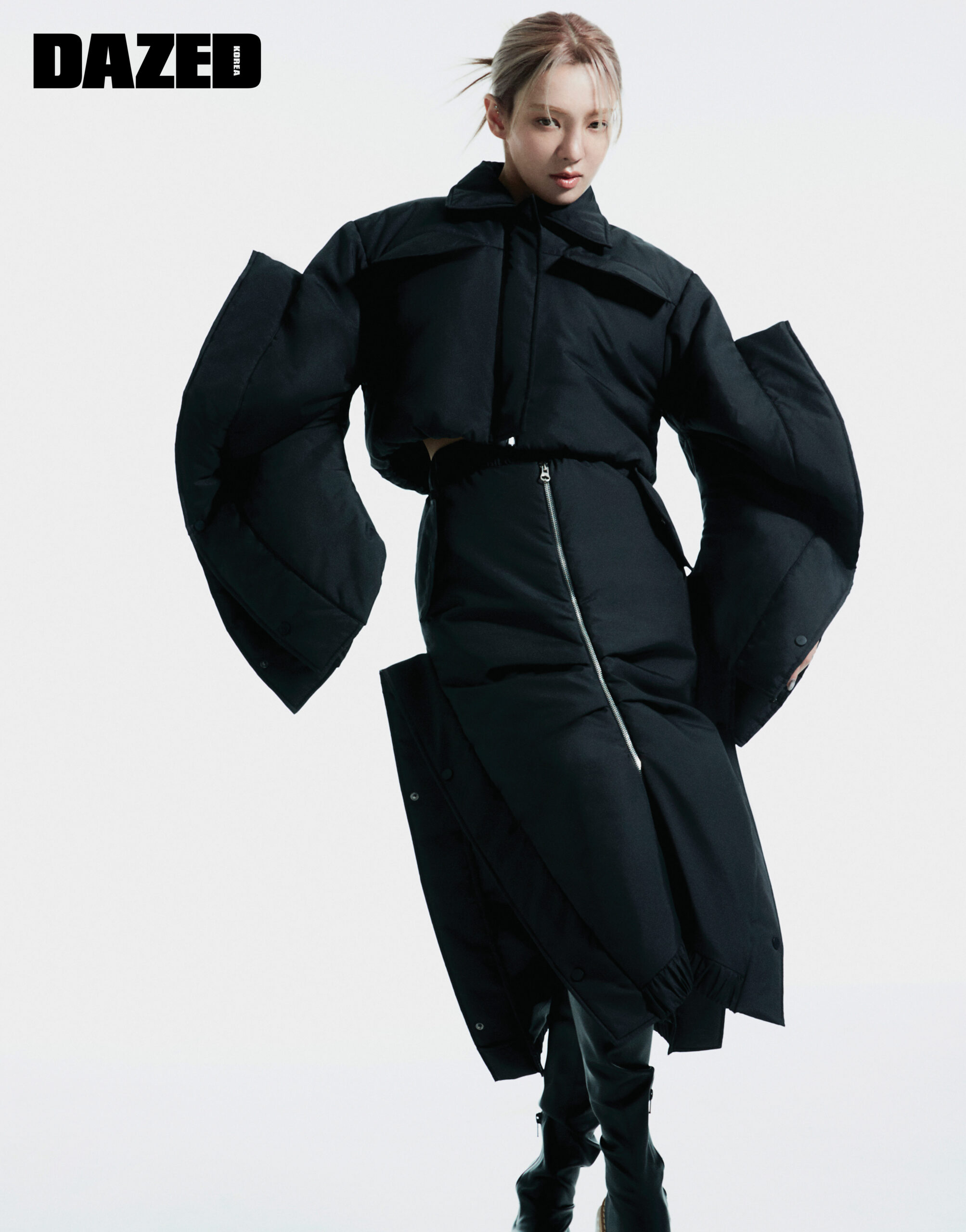 독특한 실루엣의 블랙 패딩 재킷과 스커트는 비스퍽(Besfxxk), 화이트 아웃솔이 돋보이는 블랙 레더 롱부츠는 스타일리스트의 것.