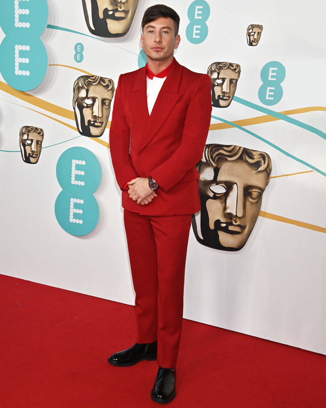 남우 조연상을 수상한 배리 케오간이 입은 석류 컬러의 그랑 드 푸드르 소재의 더블 브레스티드 테일러드 재킷과 시가렛 팬츠, 이와 대조되는 레드 칼라 디테일의 화이트 컬러 포플린 코튼 소재 셔츠, 블랙 컬러 유광 레더 소재의 트레드 슬림 부츠는 모두 알렉산더 맥퀸(Alexander McQueen).
