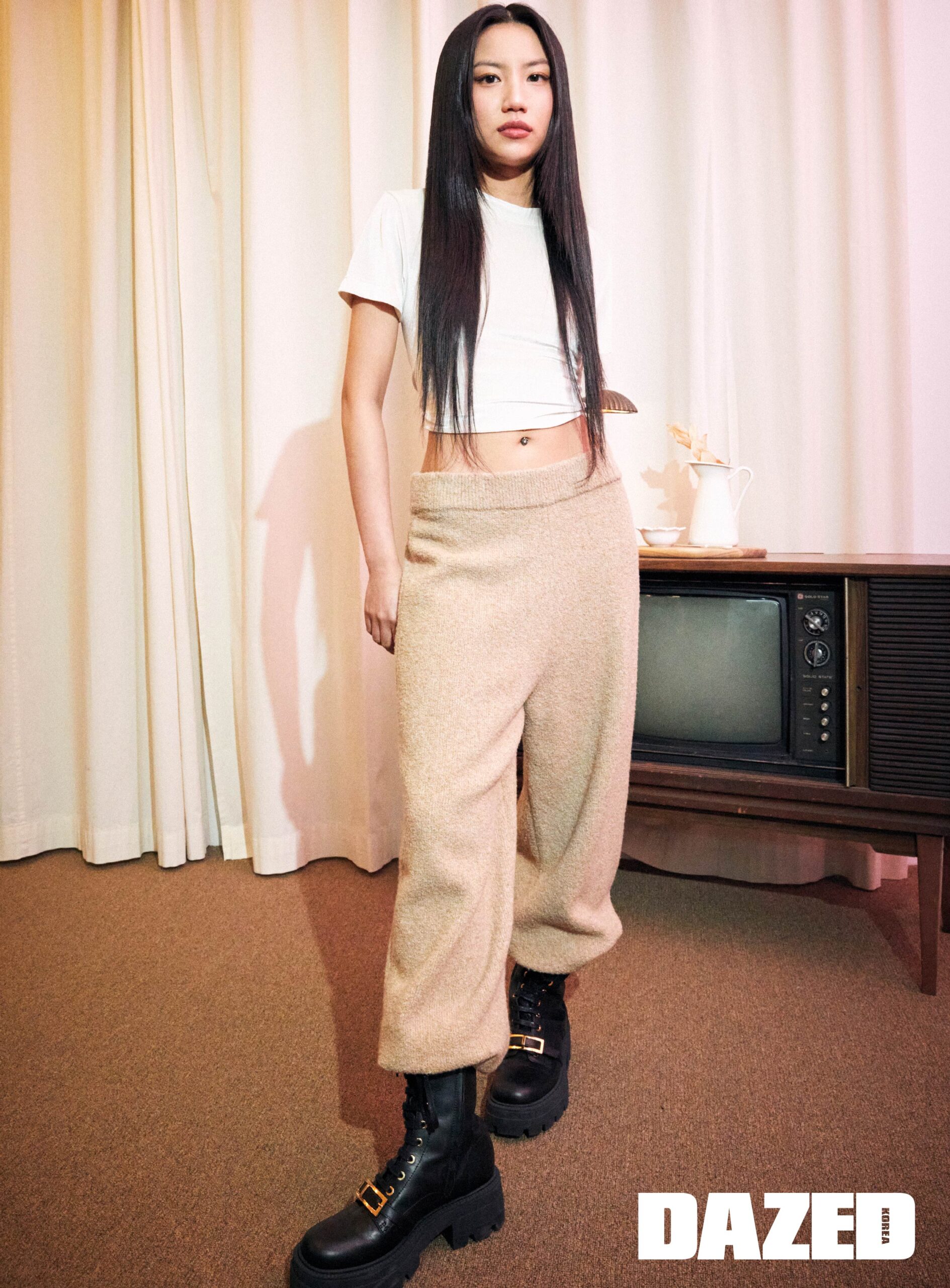 벨벳 티셔츠와 부클 니트 롱 팬츠는 디 애퍼처(The Aperture), 부츠는 에디터의 것.