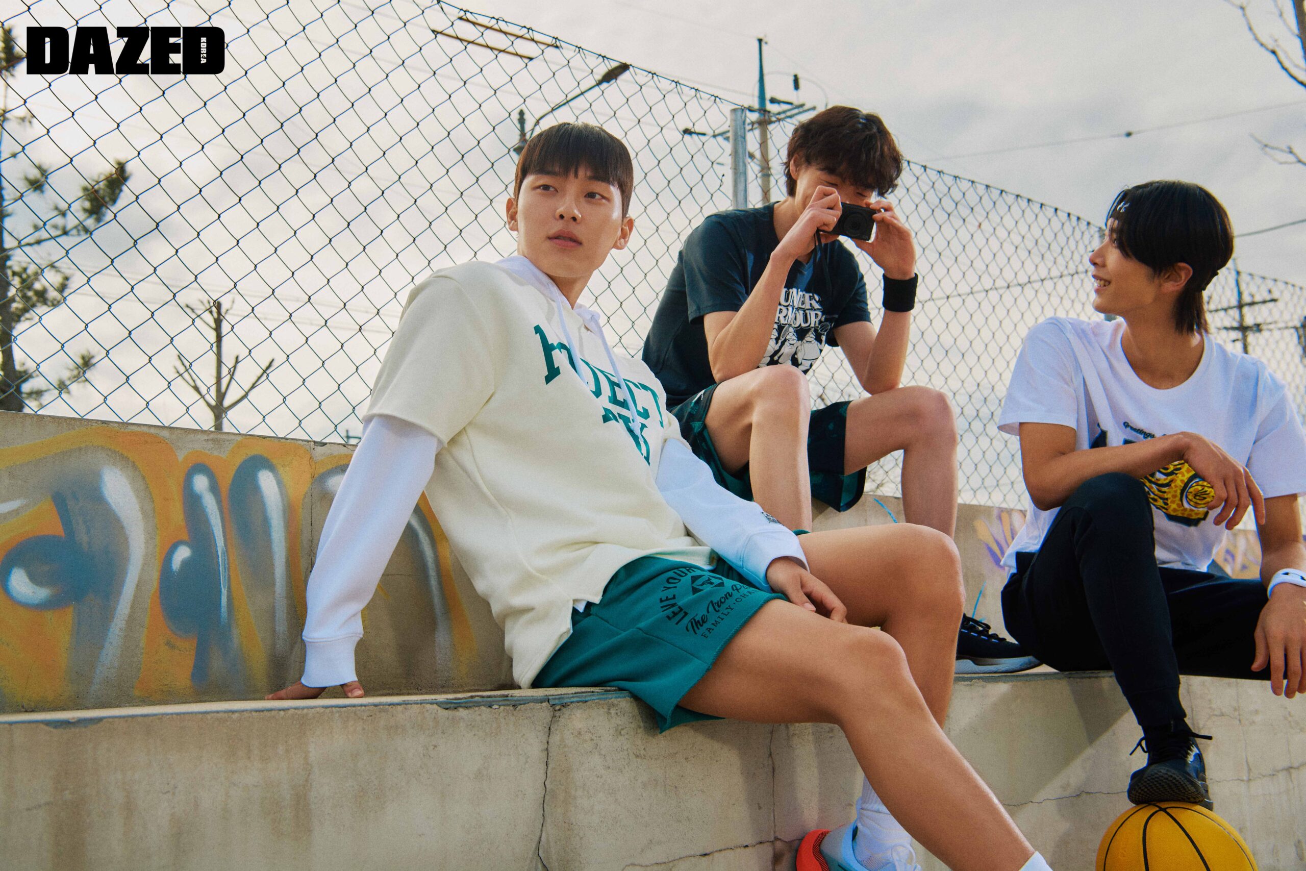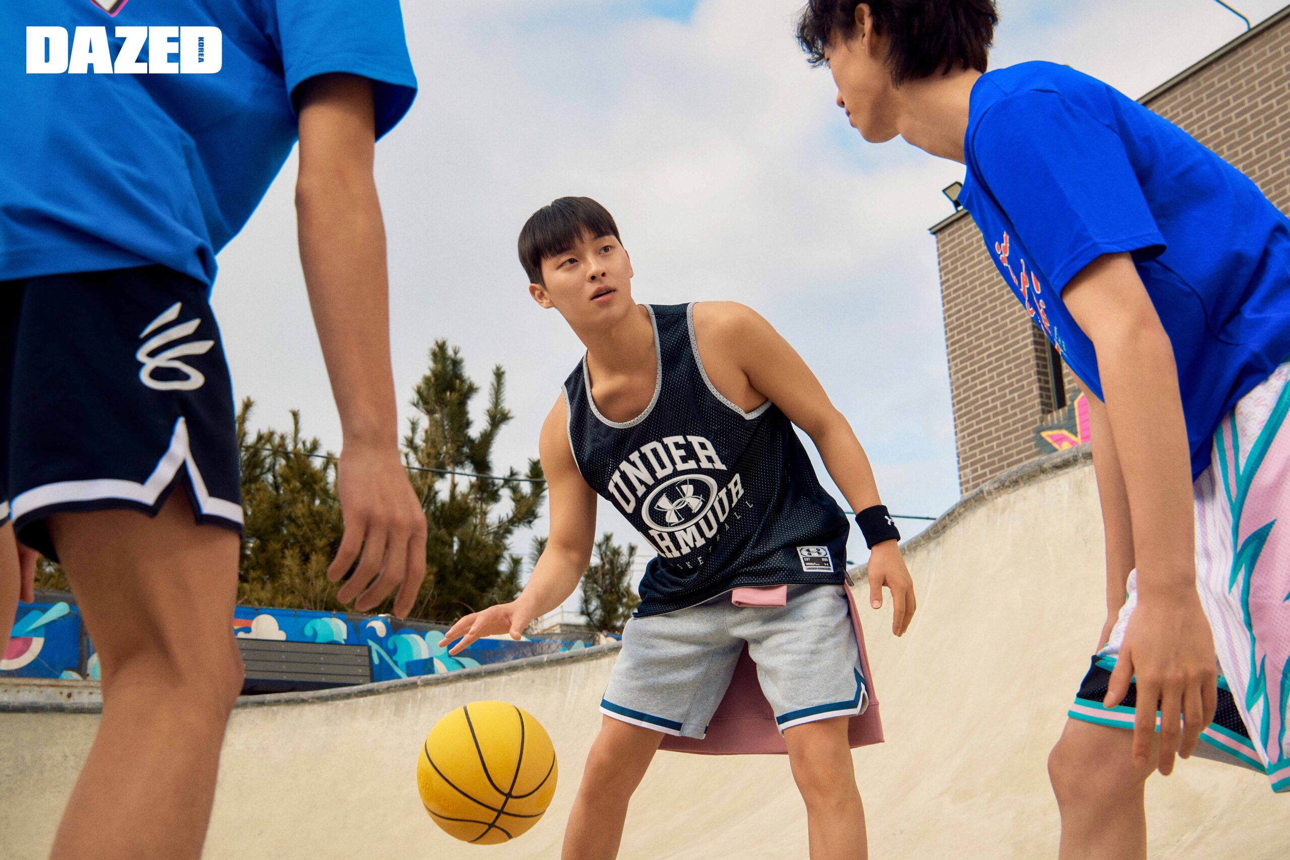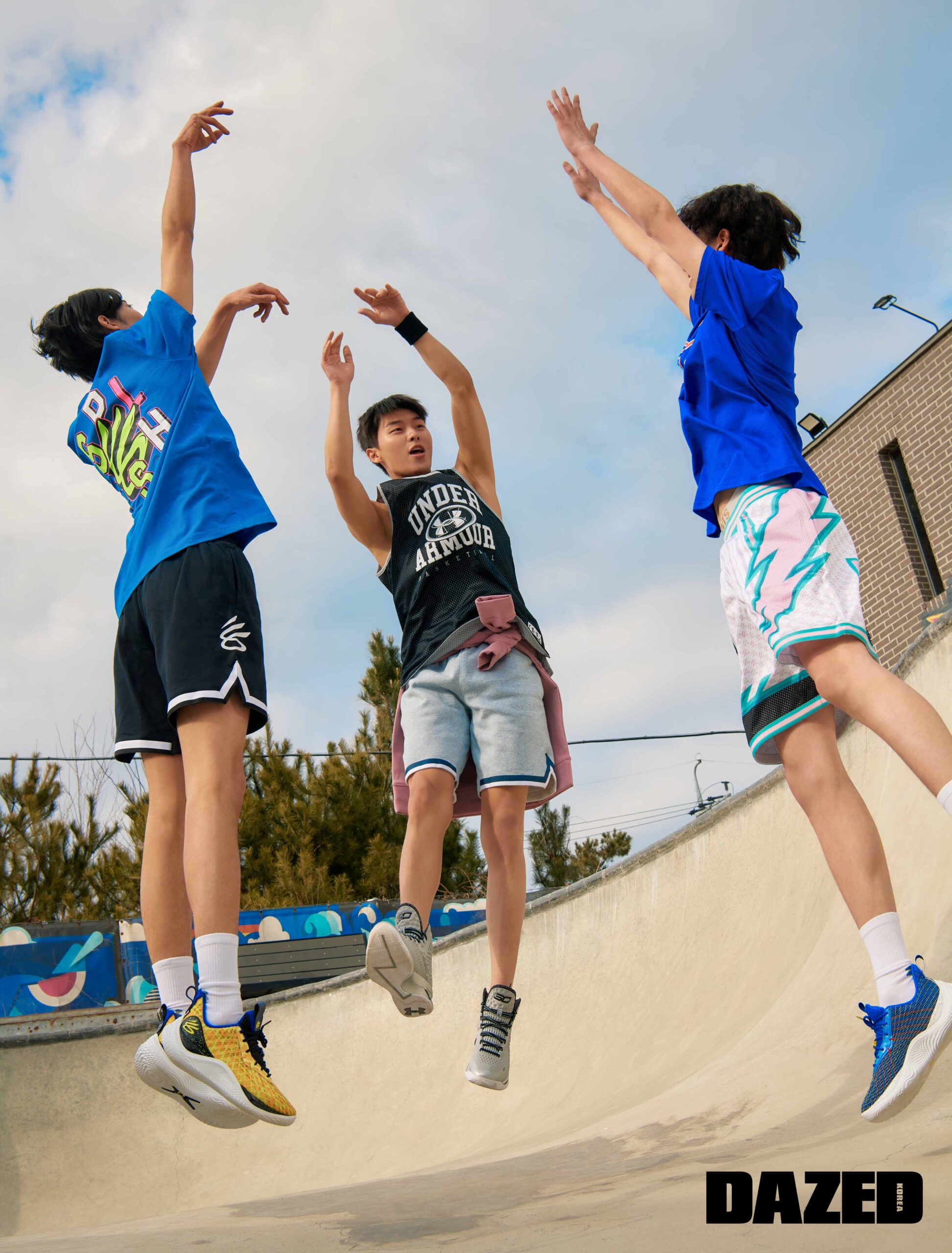 태양이 입은 UA 커리 스플래시 파티 반팔과 커리 플리스 9인치 쇼츠는 언더아머(Under Armour). 현욱이 입은 UA 베이스라인 리버서블 저지와 허리에 묶어 연출한 UA 서밋 니트 크루, 커리 플리스 9인치 쇼츠, 손목 보호대는 모두 언더아머(Under Armour). 승민이 입은 프린트 반팔과 우븐 쇼츠는 언더아머(Under Armour).