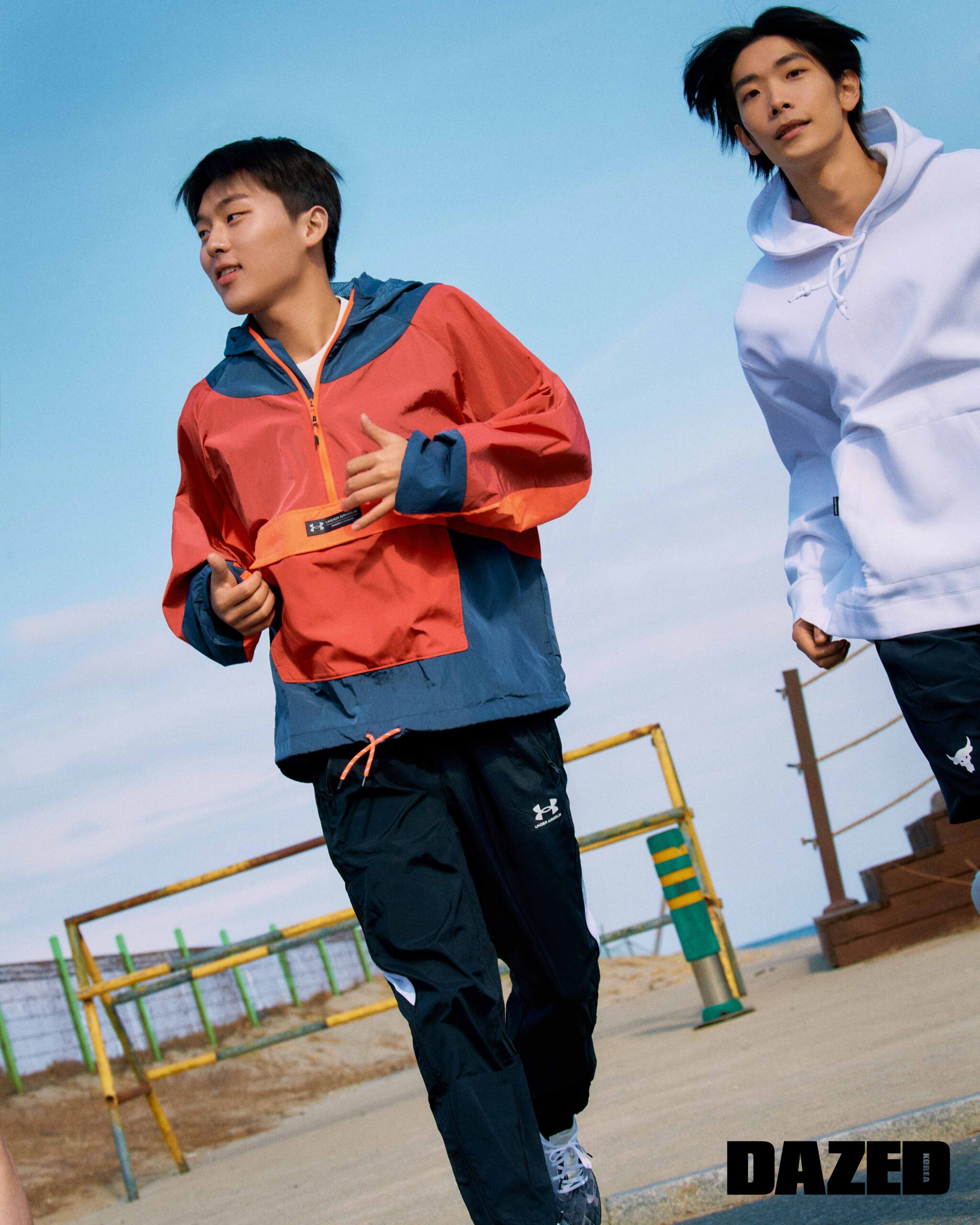 현욱이 입은 UA RUSH 우븐 하프 집 아노락과 UA 프로젝트 락 브라마 불 반팔, APAC 우븐 팬츠, 농구화는 모두 언더아머(Under Armour). 태양이 입은 후디와 쇼츠는 언더아머(Under Armour).