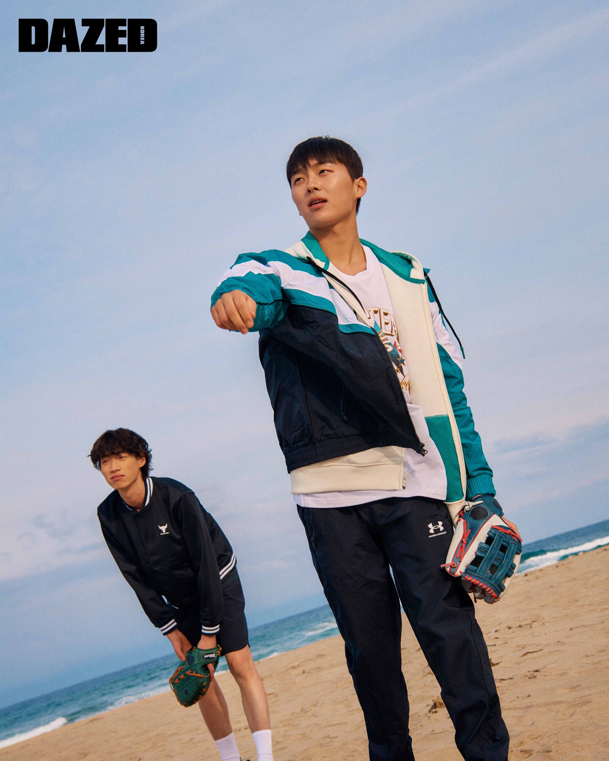 승민이 입은 프로젝트 락 메쉬 바시티 재킷과 쇼츠, 삭스는 모두 언더아머(Under Armour). 현욱이 입은 APAC 우븐 재킷과 프로젝트 락 헤비 웨이트 테리 풀 집, 커리 올 스타 게임 반팔, APAC 우븐 팬츠는 모두 언더아머(Under Armour).