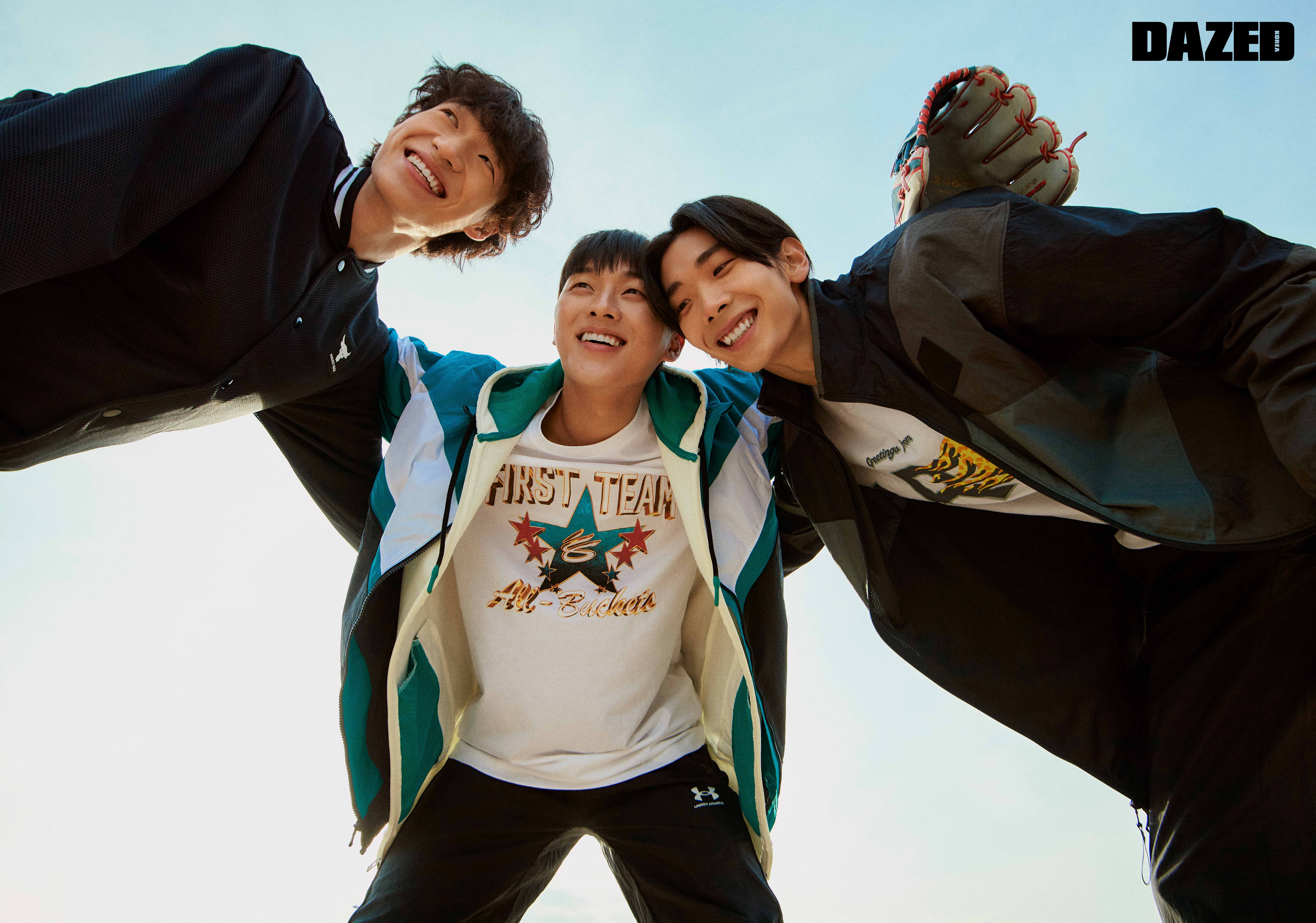 승민이 입은 프로젝트 락 메쉬 바서티 재킷은 언더아머(Under Armour). 현욱이 입은 APAC 우븐 재킷과 프로젝트 락 헤비웨이트 테리 풀 집, 커리 올 스타 게임 반팔, APAC 우븐 팬츠는 모두 언더아머(Under Armour). 태양이 입은 커리 풀 집 우븐 재킷과 커리 ARC 반팔, 커리 우븐 7인치 쇼츠는 모두 언더아머(Under Armour).