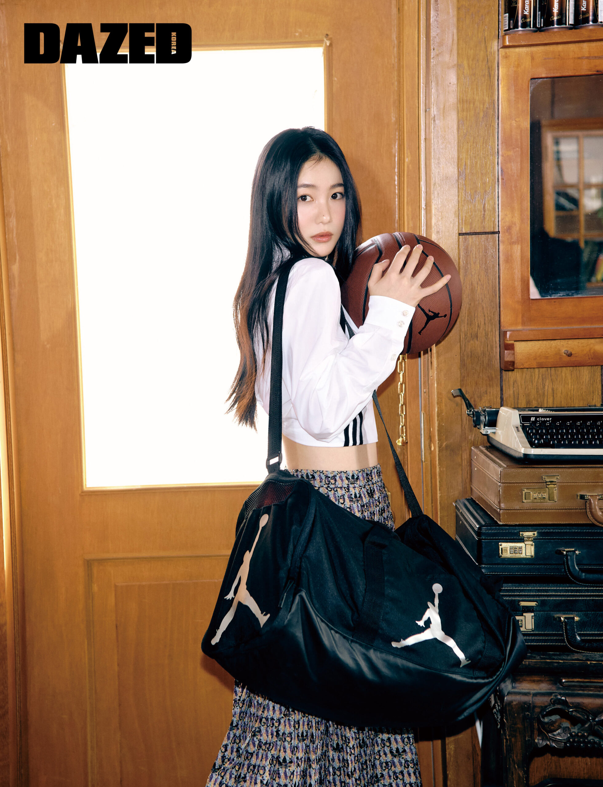 3-스트라이프가 돋보이는 셔츠와 패턴 스커트는 아디다스ⅹ구찌(adidasⅹGucci), 조던 하이퍼 그립 볼과 트레이너 더플백은 나이키(Nike).