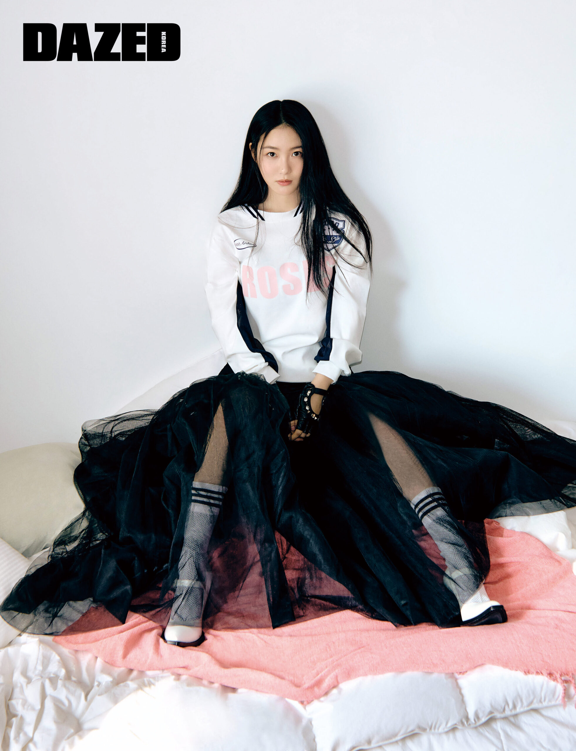 스포티 져지 톱은 2000아카이브스(2000Archives), 시스루 스커트는 에이치엔엠(H&M), 화이트 메리제인 힐은 프라다(Prada), 크리스털 장식의 하프 글러브는 돌체앤가바나(Dolce&Gabbana), 3-스트라이프가 돋보이는 삭스는 아디다스ⅹ구찌(adidasⅹGucci).