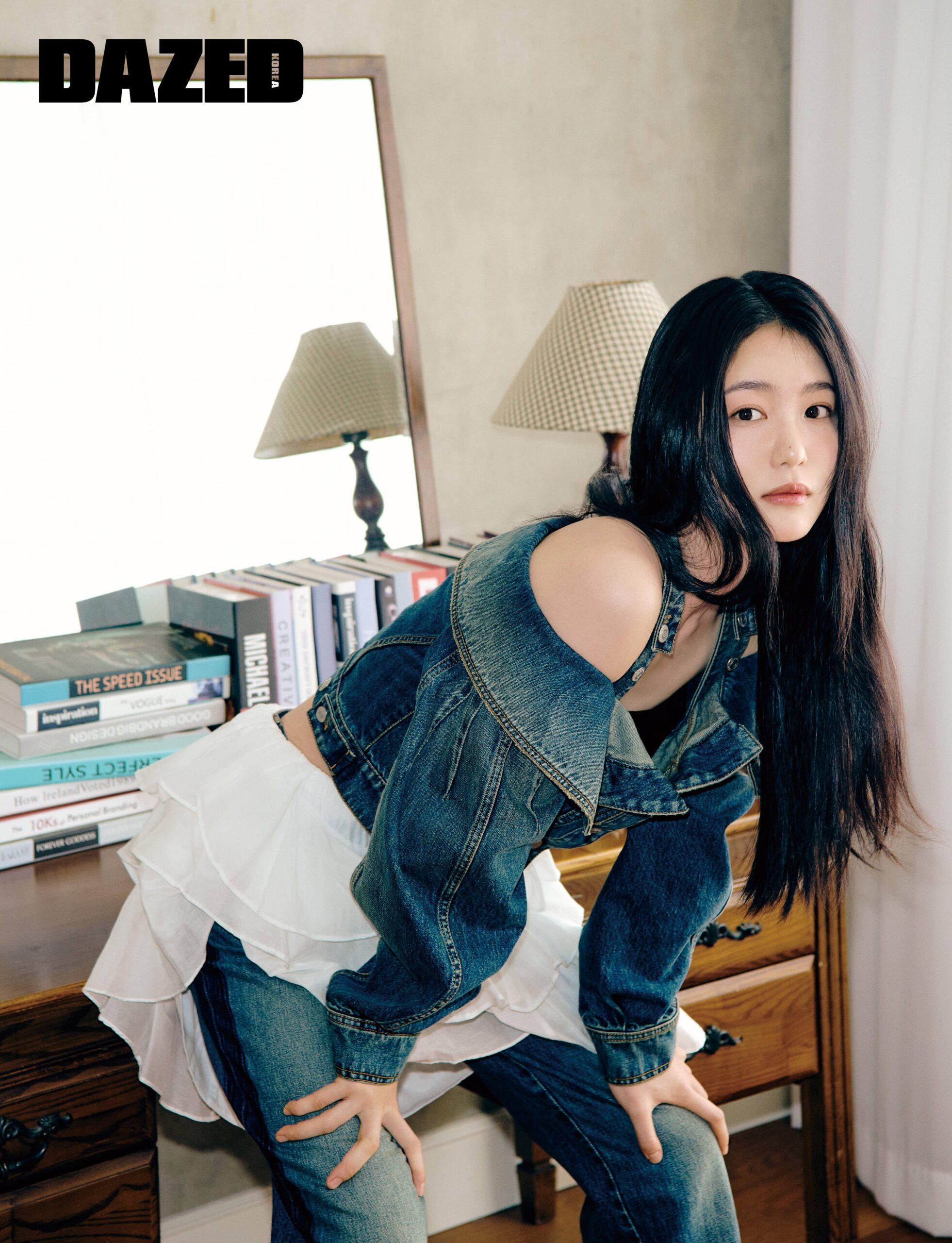 오프숄더 데님 톱과 팬츠, 실버 이어링은 모두 알렉산더 맥퀸(Alexander McQueen), 스커트로 연출한 화이트 러플 드레스는 방떼(Venté).