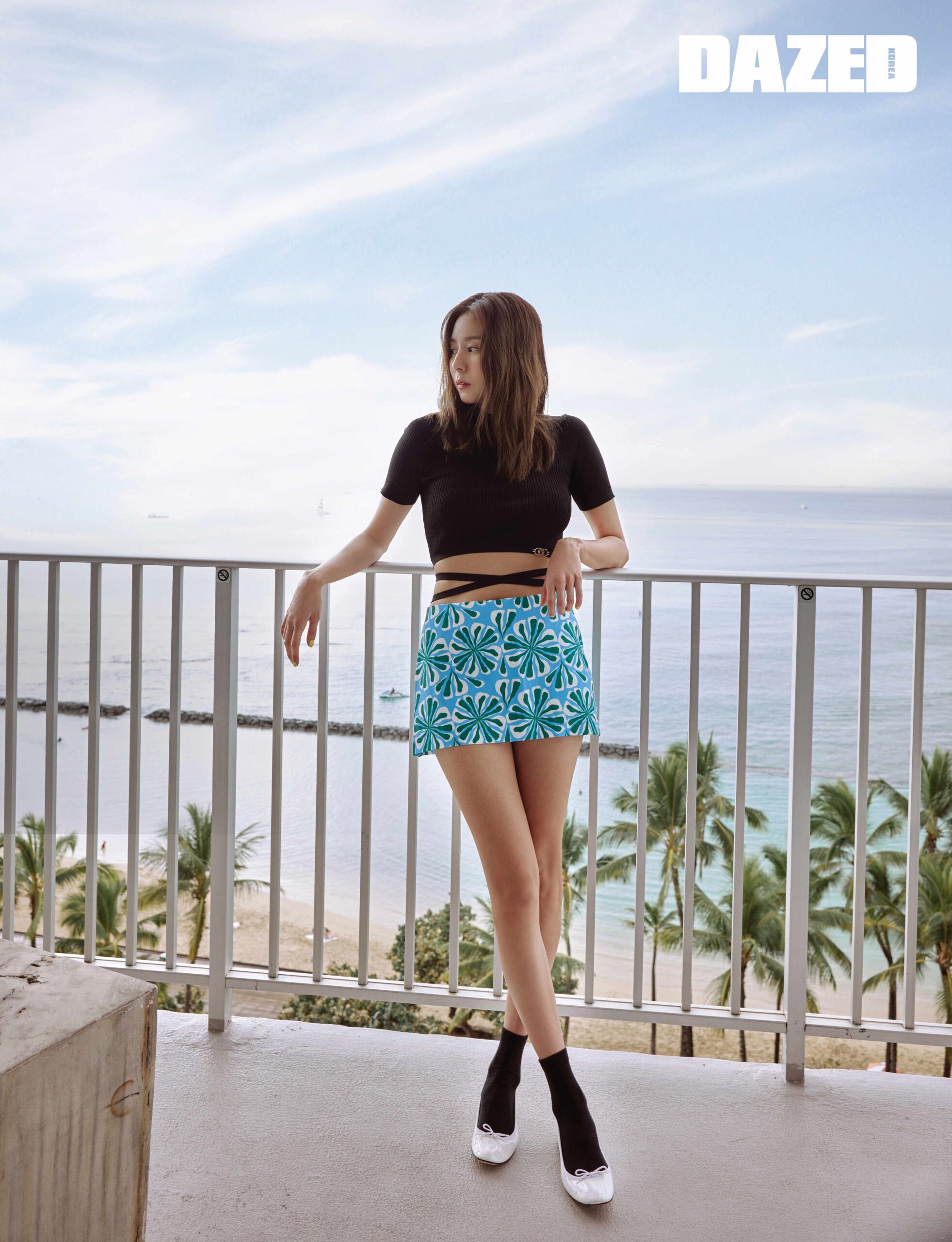 블랙 크롭트 톱은 마쥬(Maje), 보태니컬 패턴 스커트는 데이즈 데이즈(Daze Dayz), 플랫 슈즈는 레페토(Repetto), 양말은 스타일리스트의 것.