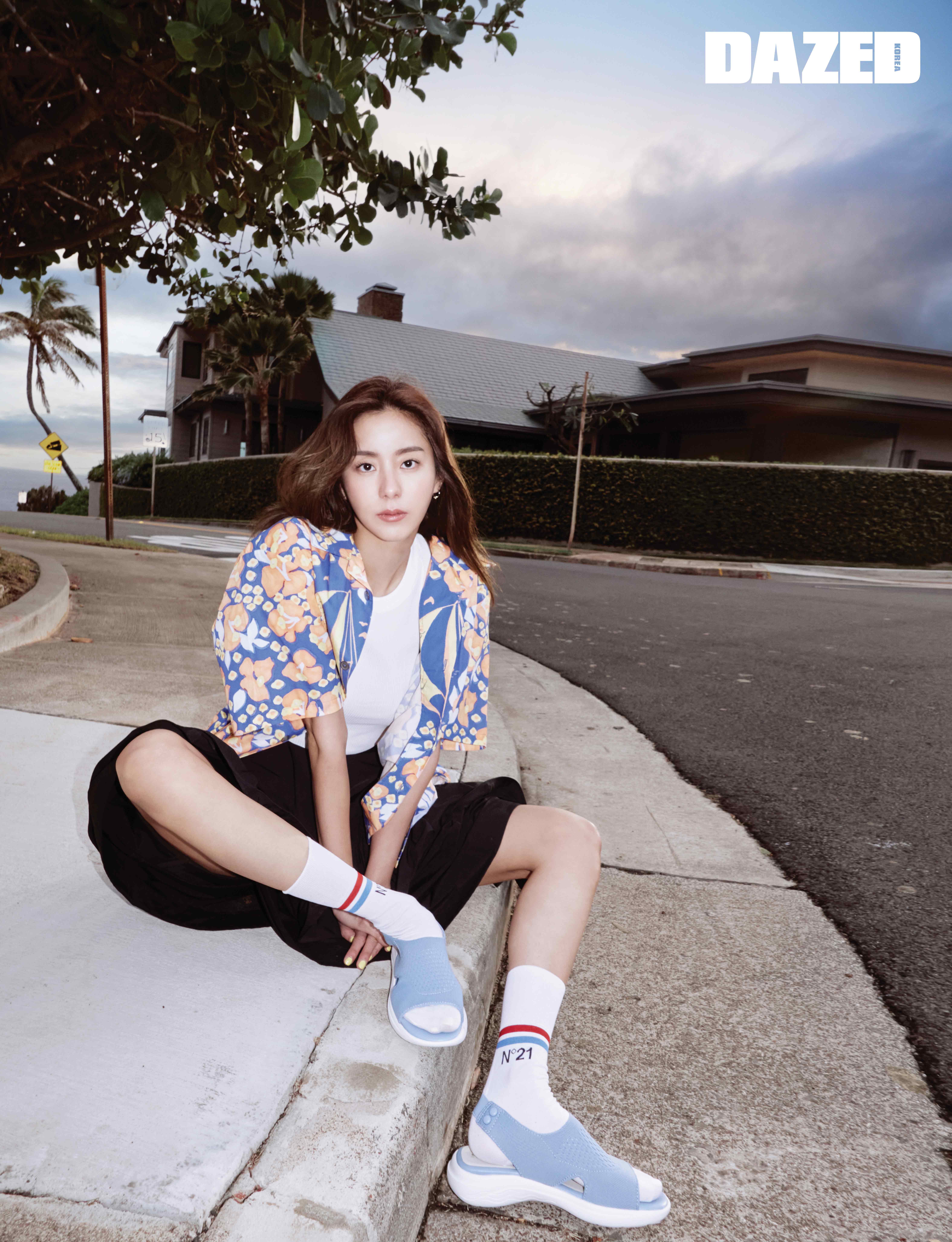 바다가 연상되는 블루 컬러의 스페리카 샌들은 제옥스(Geox), 이어링은 블랙뮤즈(Blackmuse), 셔츠와 톱, 스커트, 양말은 모두 스타일리스트의 것.