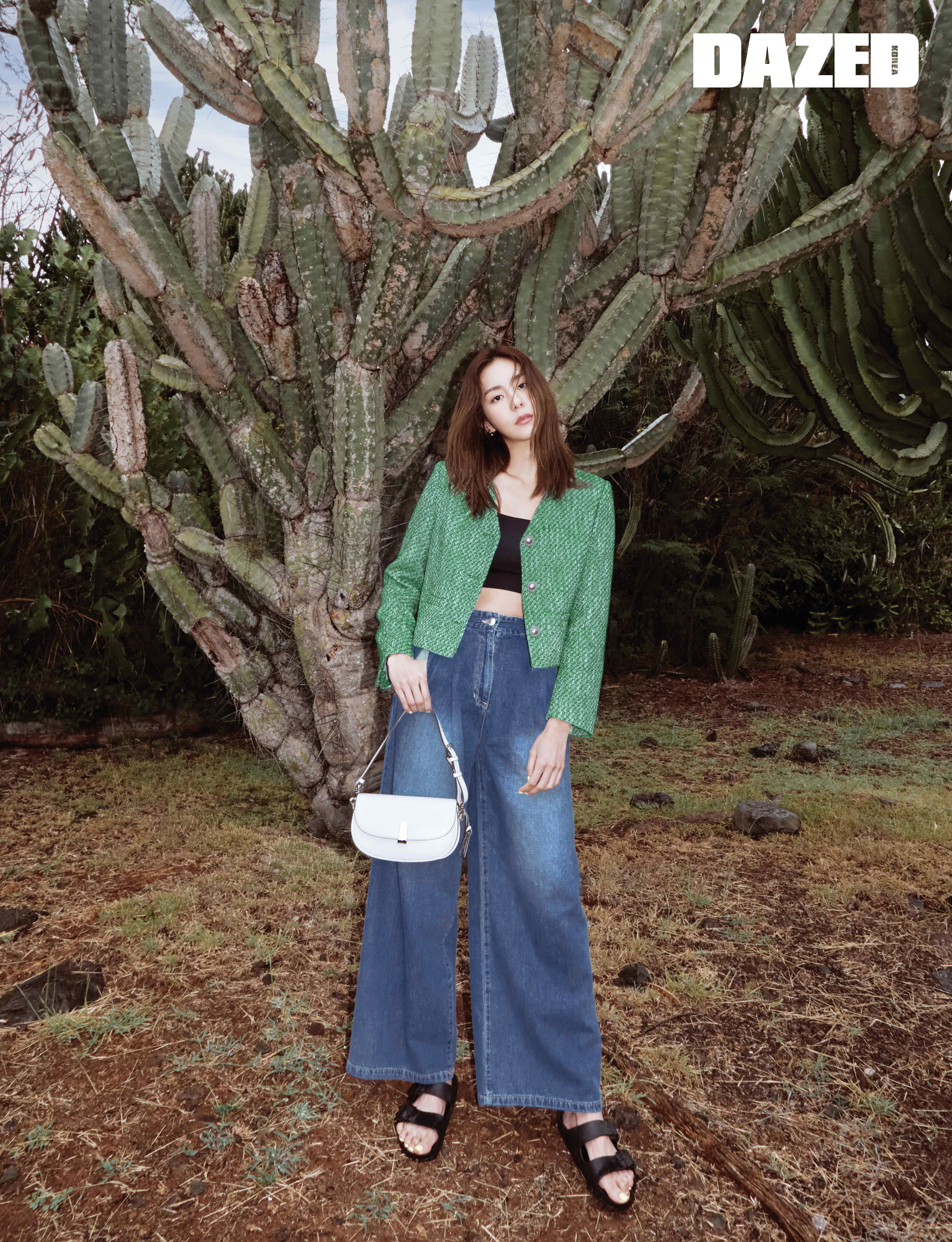 그린 컬러의 유니크한 트위드 재킷과 워싱 디테일의 와이드 데님 팬츠, 깔끔한 컬러감과 볼륨 있는 셰이프의 마고 숄더백은 모두 조이그라이슨(Joy Gryson), 이어링은 블랙뮤즈(Blackmuse), 톱과 슬라이더는 스타일리스트의 것.