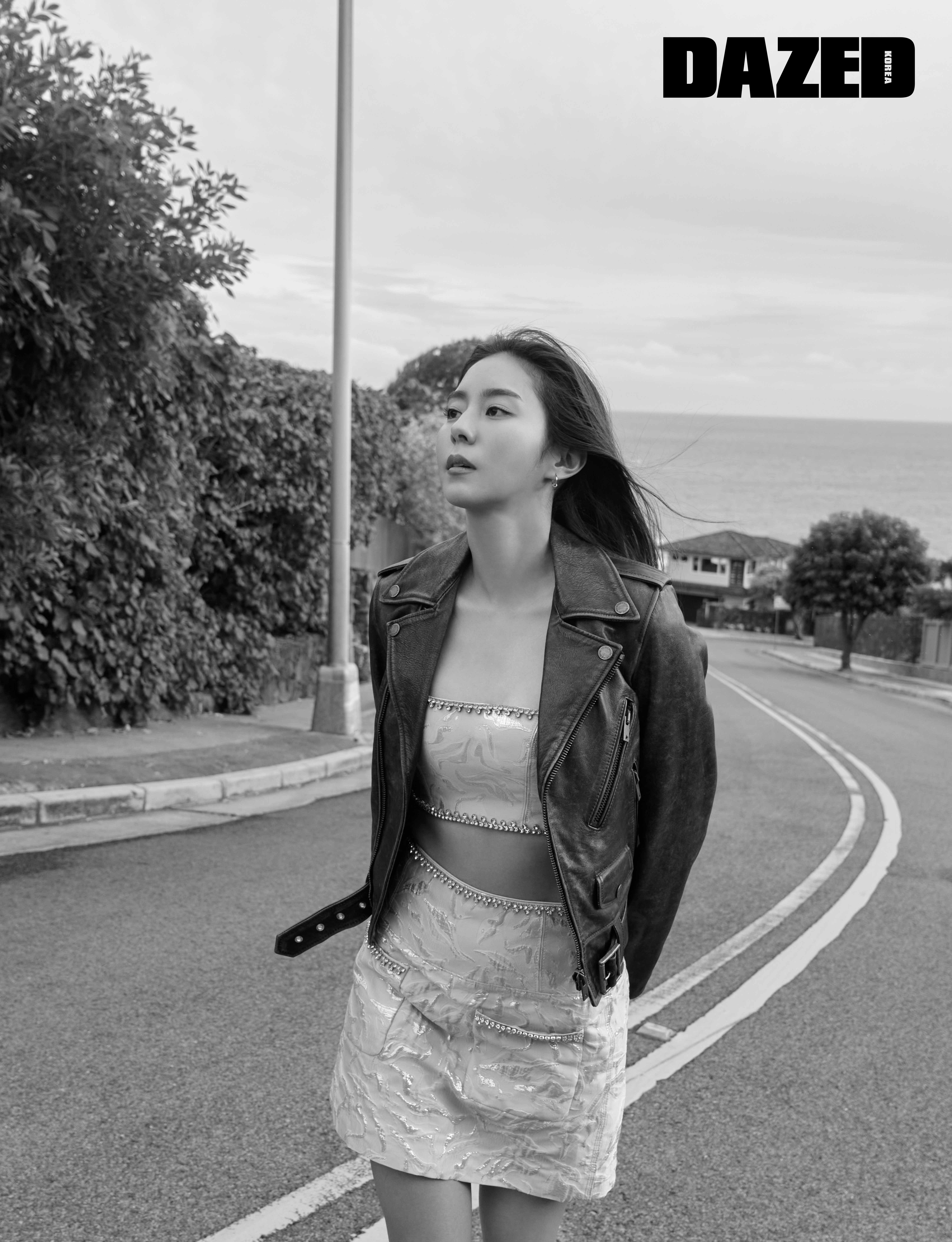 라이더 재킷과 웨스턴 부츠는 골든구스(Golden Goose), 슬리브리스 톱과 스커트는 모두 에이치앤엠 이노베이션 스토리(H&M Innovation Re-Enchantment Story), 이어링은 블랙뮤즈(Blackmuse).