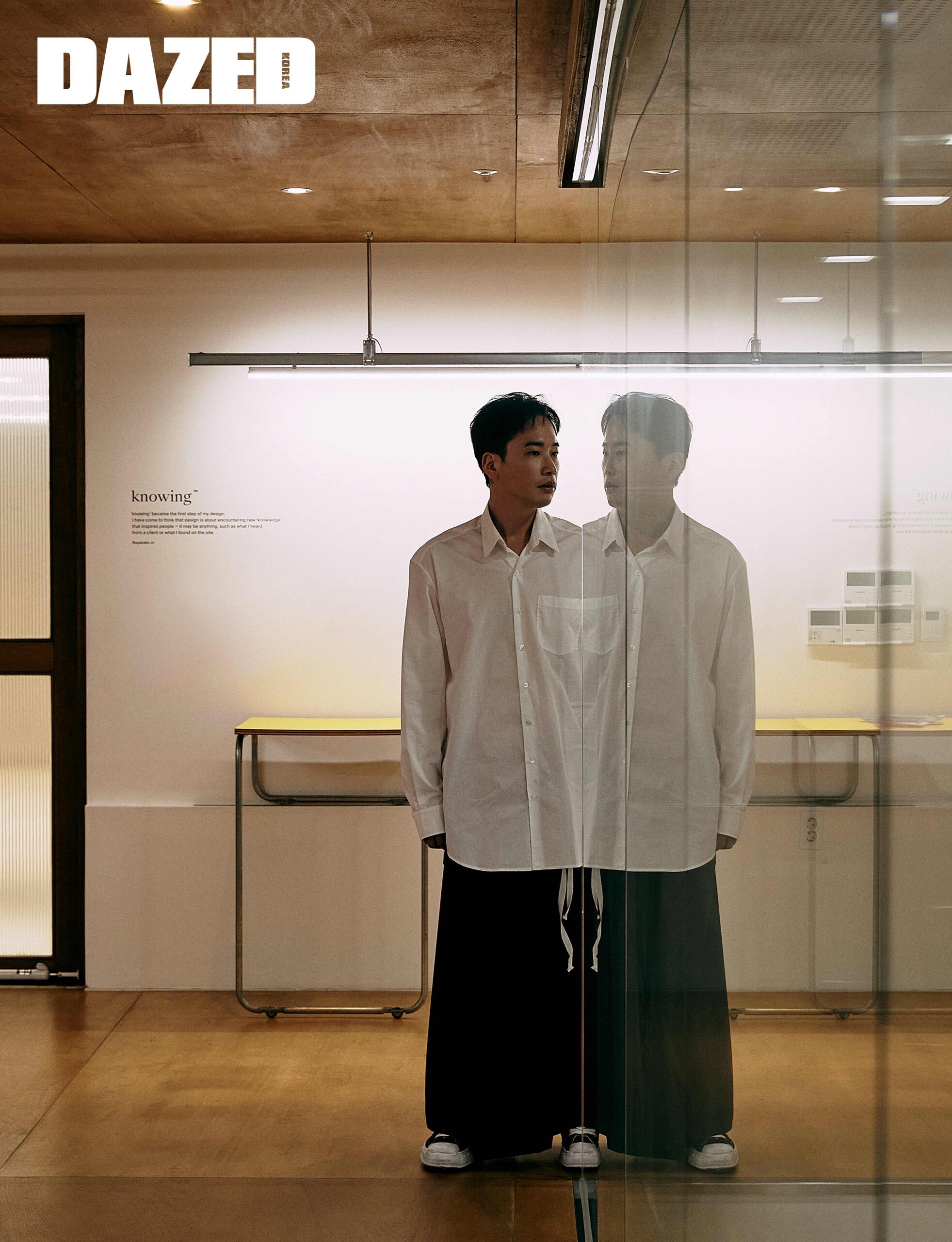 셔츠는 앤 드뮐미스터(Ann Demuelemeester), 팬츠는 무홍(Moohong), 슈즈는 메종 미하라 야스히로(Maison Mihara Yasuhiro).