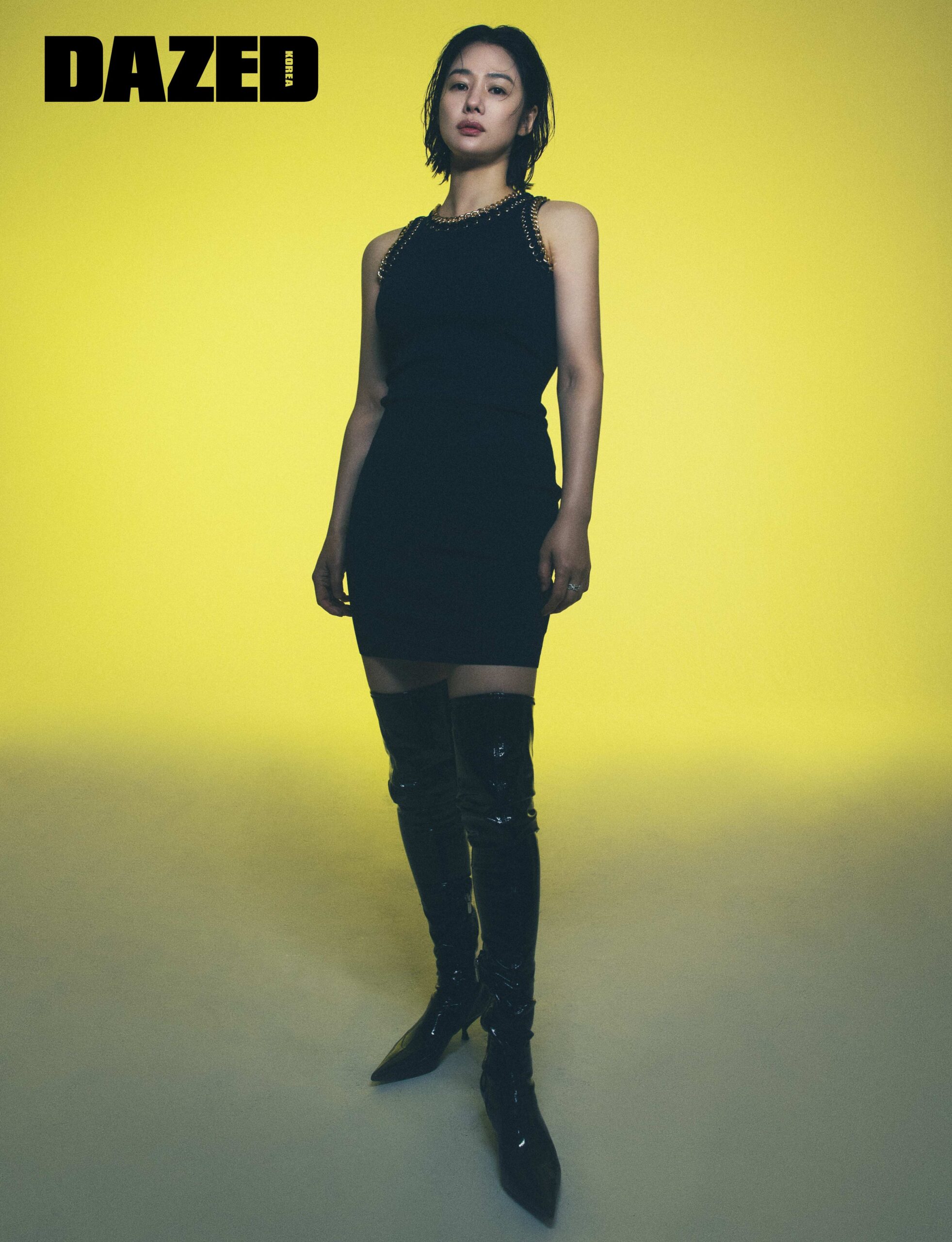 네크라인에 체인을 장식한 미니 원피스는 마이클 마이클 코어스(Michael Michael Kors), 다이아몬드 반지는 프레드(Fred), 사이하이 부츠는 세르지오 로시(Sergio Rossi).