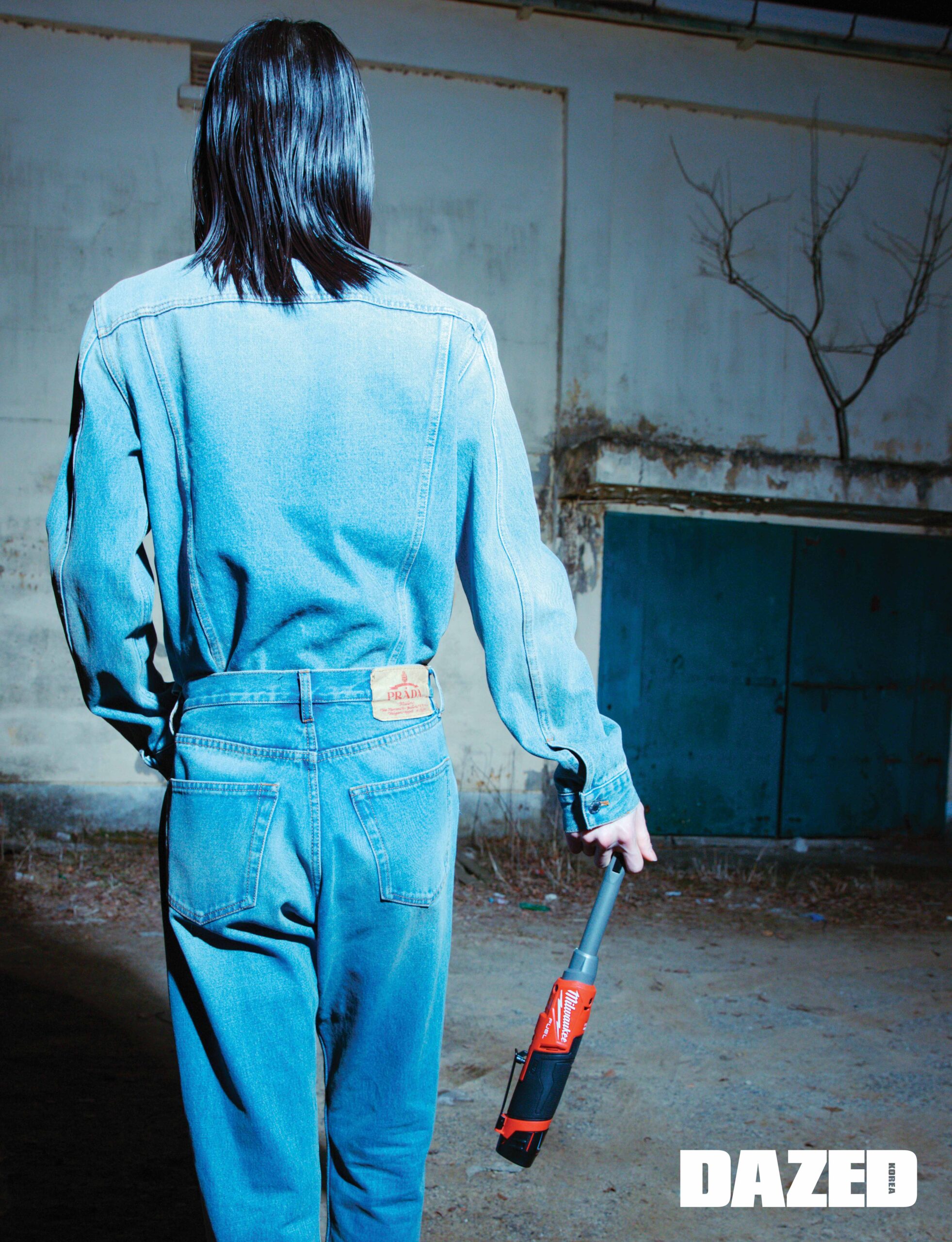 블루 데님 재킷과 팬츠는 프라다(Prada).
