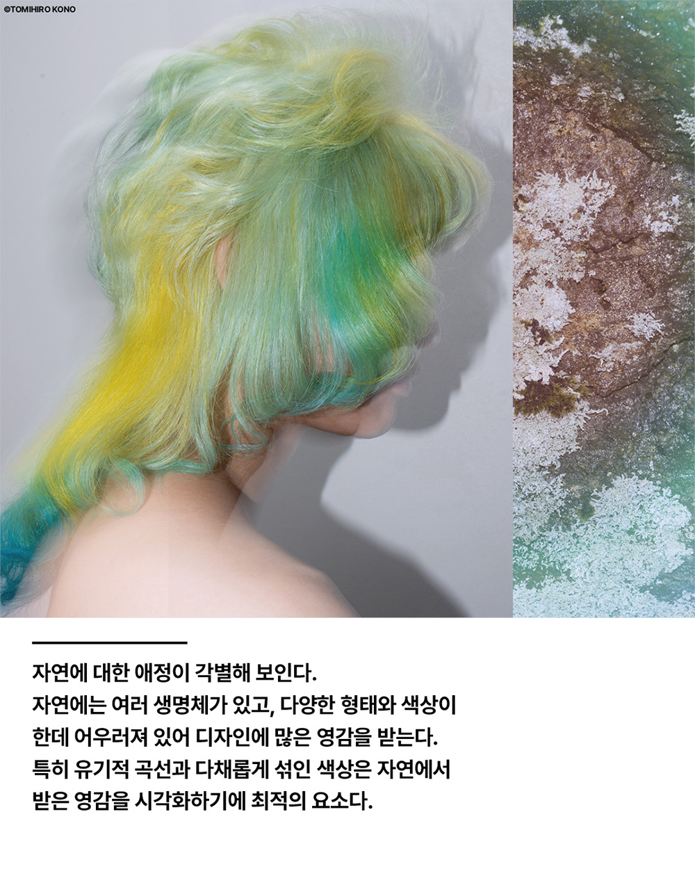 자연에는 여러 생명체가 있고, 다양한 형태와 색상이 한데 어우러져 있어 디자인에 많은 영감을 받는다. 특히 유기적 곡선과 다채롭게 섞인 색상은 자연에서 받은 영감을 시각화하기에 최적의 요소다.