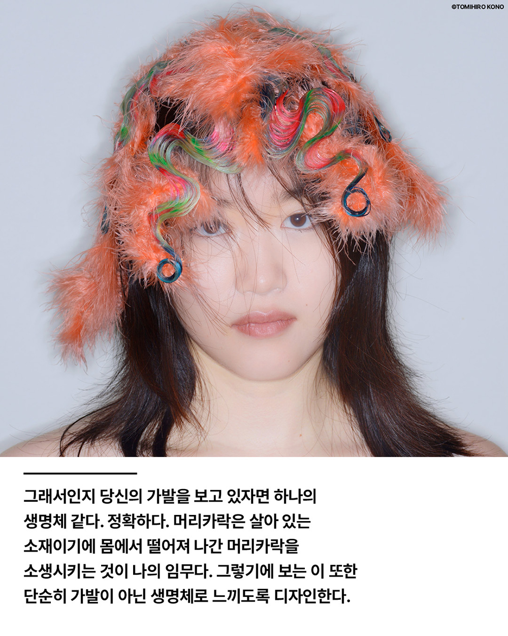 정확하다. 머리카락은 살아 있는 소재이기에 몸에서 떨어져 나간 머리카락을 소생시키는 것이 나의 임무다. 그렇기에 보는 이 또한 단순히 가발이 아닌 생명체로 느끼도록 디자인한다.