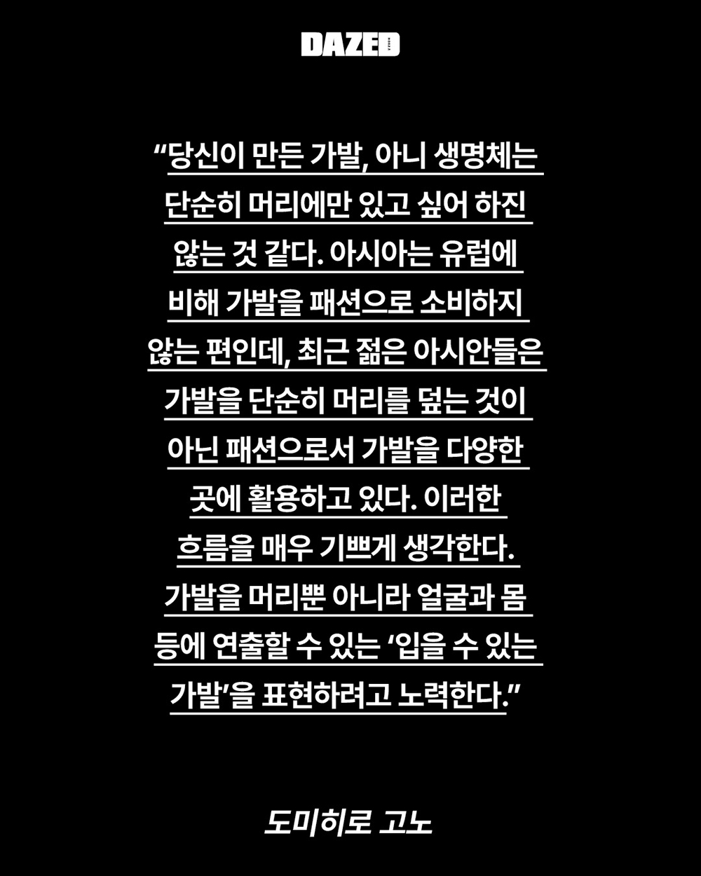 아시아는 유럽에 비해 가발을 패션으로 소비하지 않는 편인데, 최근 젊은 아시안들은 가발을 단순히 머리를 덮는 것이 아닌 패션으로서 가발을 다양한 곳에 활용하고 있다. 이러한 흐름을 매우 기쁘게 생각한다. 가발을 머리뿐 아니라 얼굴과 몸 등에 연출할 수 있는 ‘입을 수 있는 가발’을 표현하려고 노력한다.