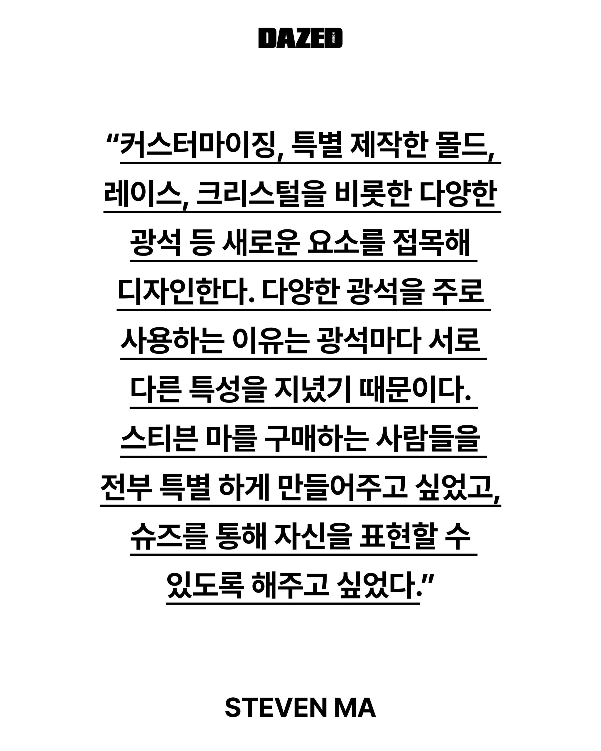 스크리너를 통해 영화를 관람할 있었다. 영화가 끝난 이후에는? 나도 모르게 부츠를 사려고 스티븐 마와 머신에이 웹사이트에 접속해 있더라. 이렇게 매력이 넘치는 브랜드 스티븐 마가 추구하는 비전을 들으며 인터뷰를 마무리하고 싶다. 먼저 많은 도움을 준 스타브로스 카렐리스(머신-에이 창립자), 씨엘 등주변 지인들에게 고맙다고 말하고 싶다. 성장해 나가는 브랜드로서 디자인적으로도, 상업적으로도 다방면으로 성공하고 싶고, 패션계뿐 아니라 다양한 분야의 창작자들과 협업한다면 더할 나위 없이 행복하지 않을까.