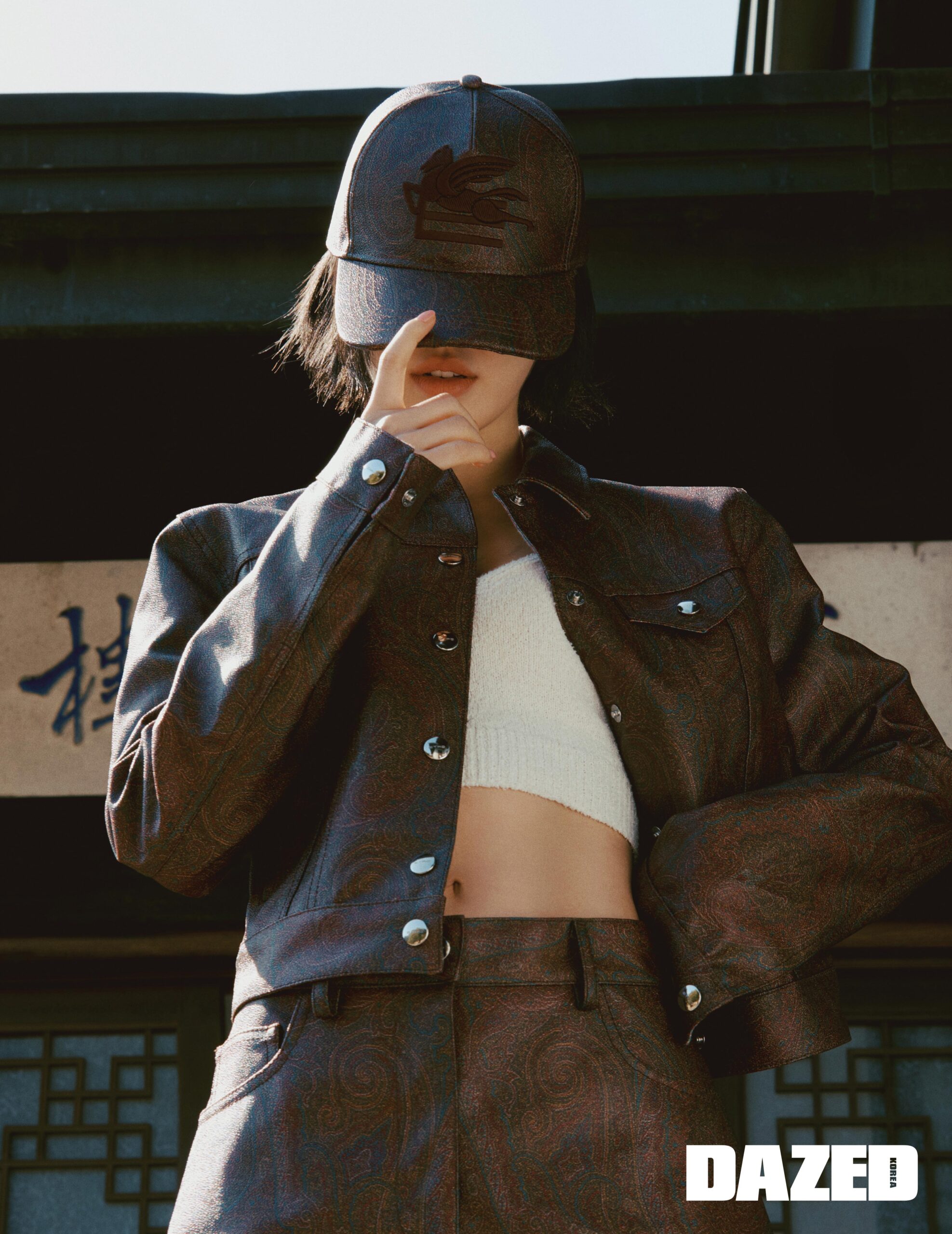 아르니카 재킷과 쇼츠, 모자는 모두 에트로(Etro), 이너로 연출한 크롭트 톱은 스타일리스트의 것.