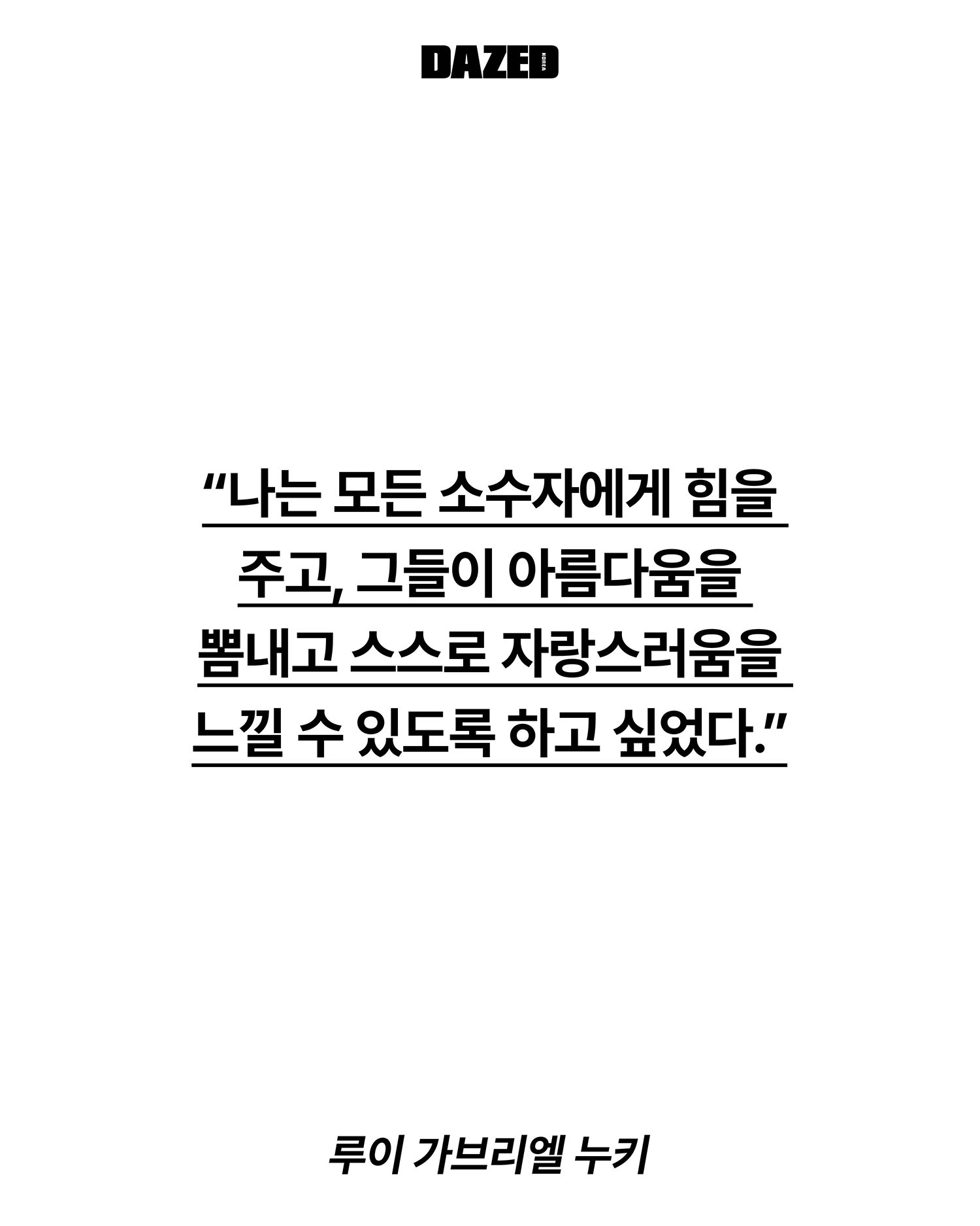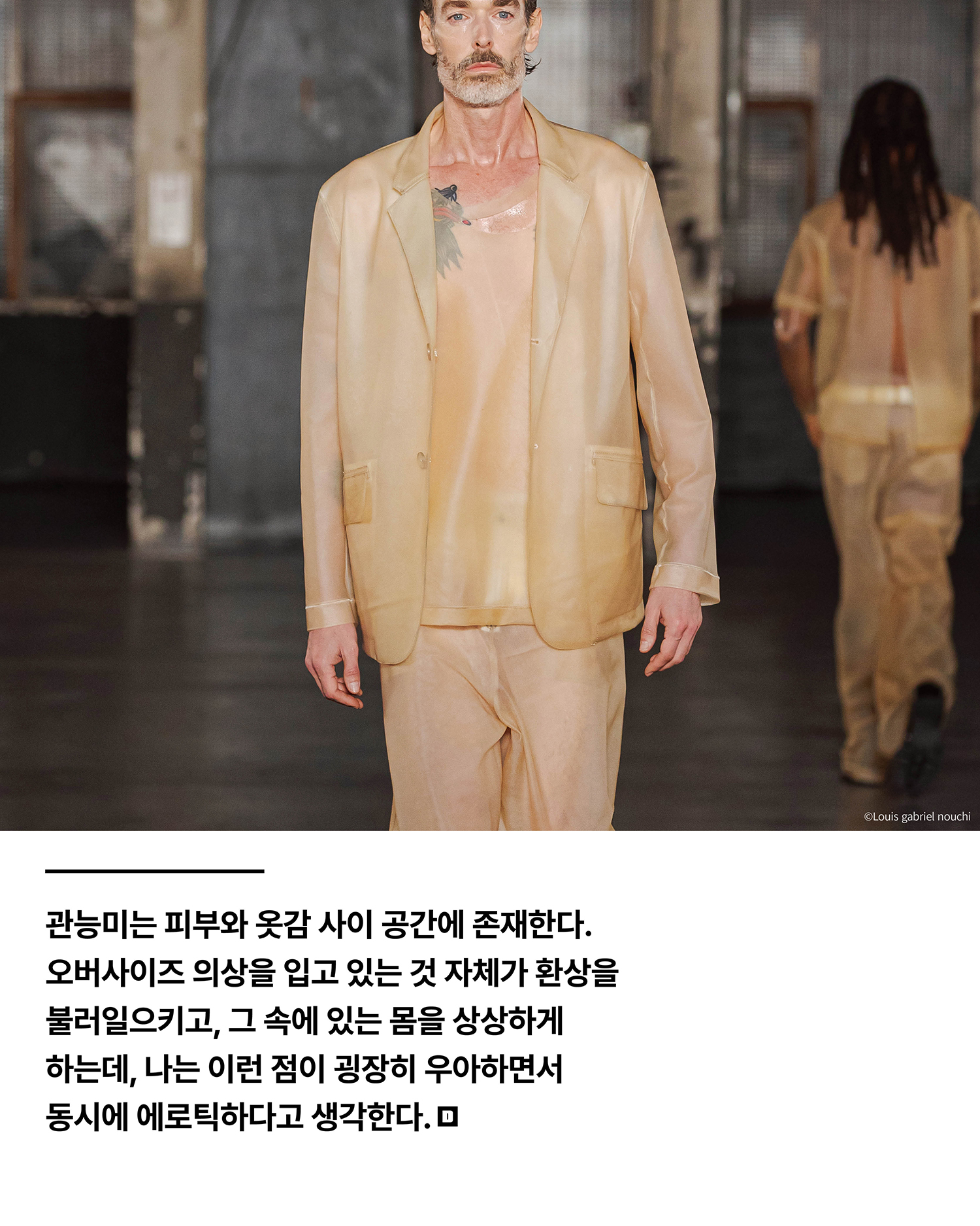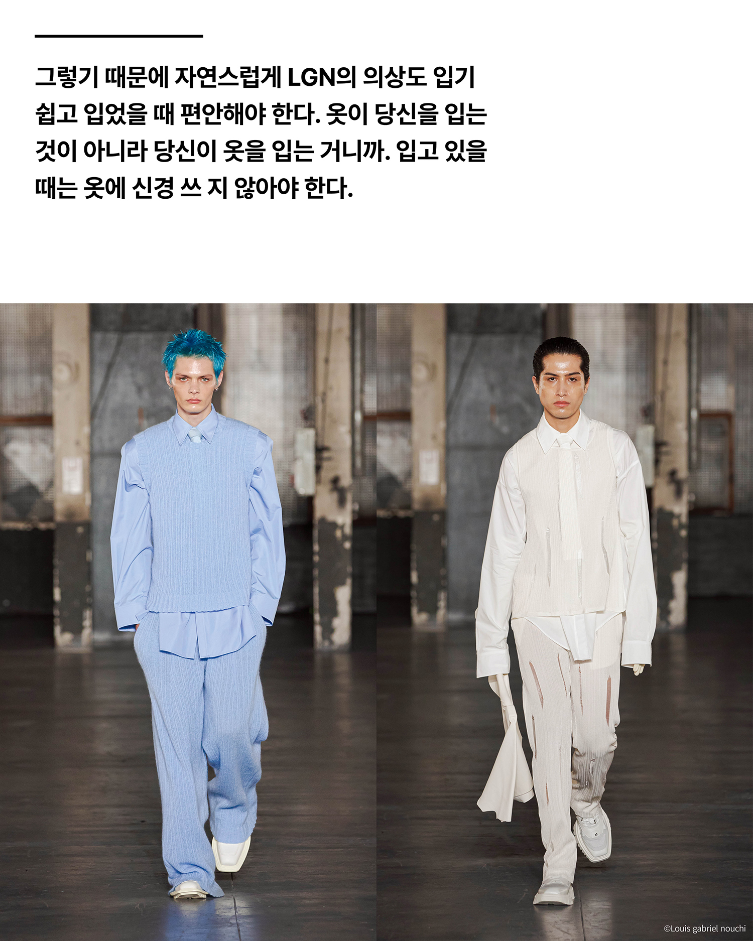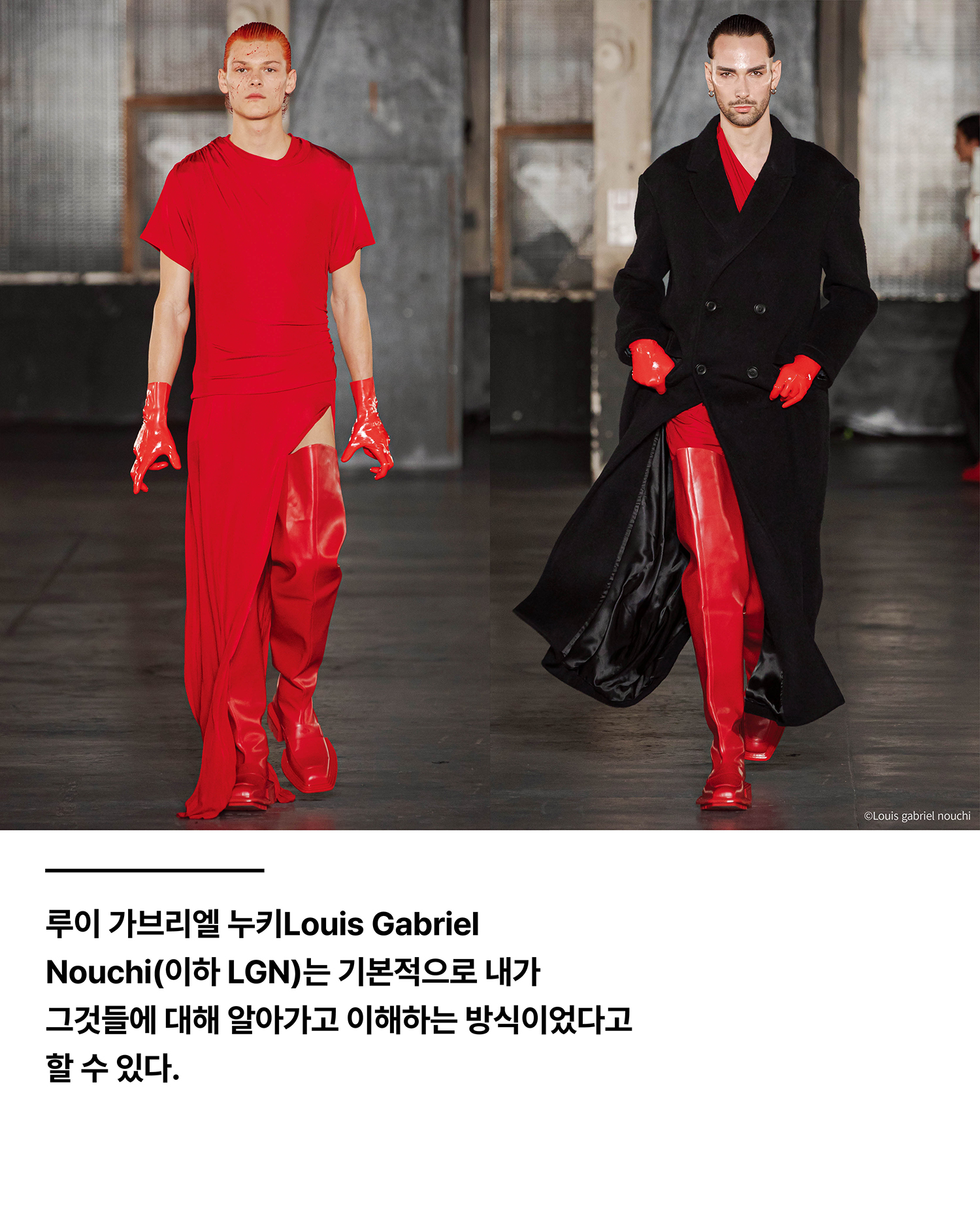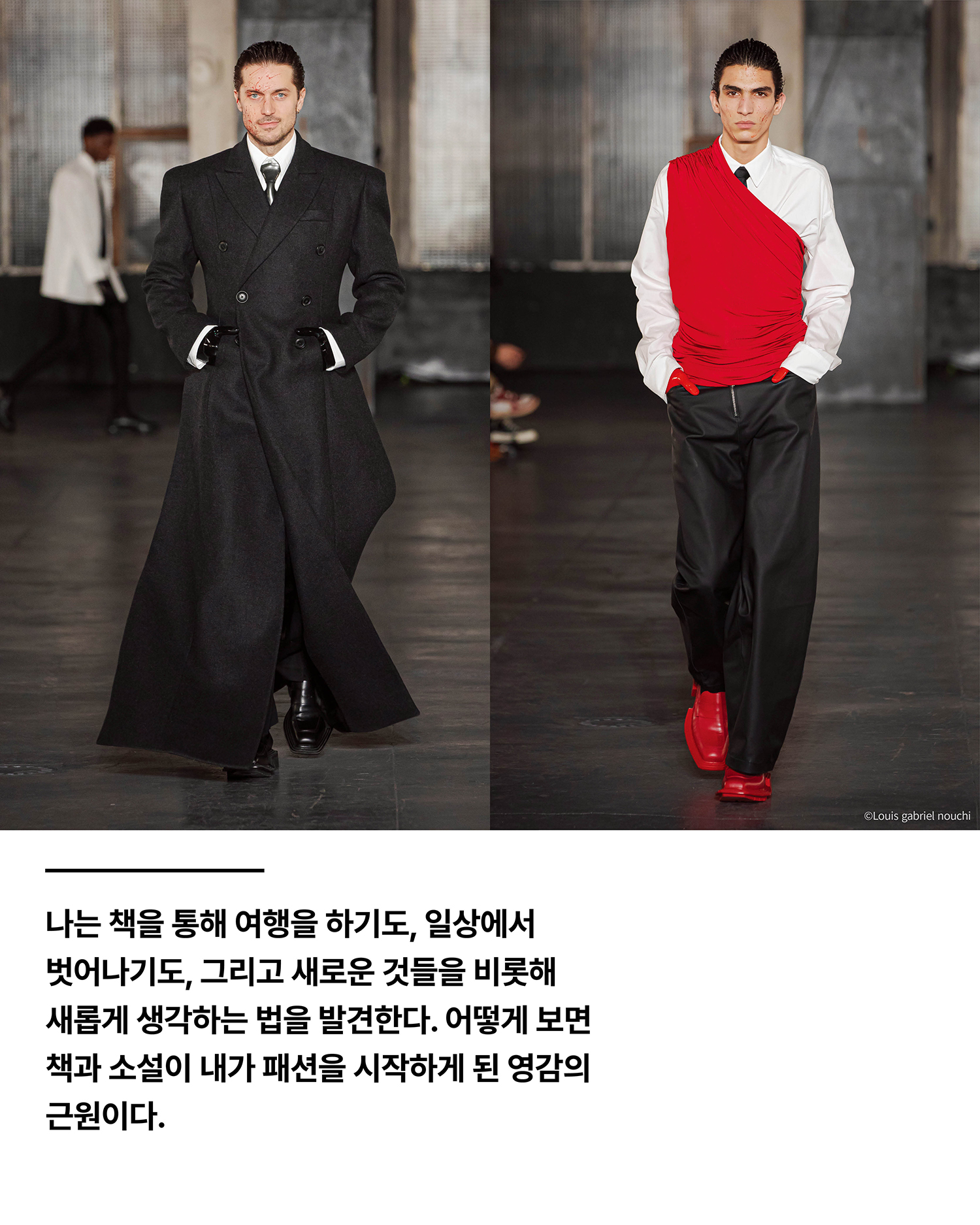 현재는 골리아르다 사피엔차의 <The Art of Joy>를 읽고 있다. 친구의 추천으로 이 작가를알게됐는데,완전히 매료됐다. 나는 책을 통해 여행을 하기도, 일상에서 벗어 나기도, 그리고 새로운 것들을 비롯해 새롭게 생각하는 법을 발견한다.어떻게 보면 책과 소설이 내가 패션을 시작하게 된. 영감의 근원이다. 루이 가브리엘 누키Louis Gabriel Nouchi(이하 LGN)는 기본적으로 내가 그것들에 대해 알아가고 이해하는 방식이었다고 할 수 있다.