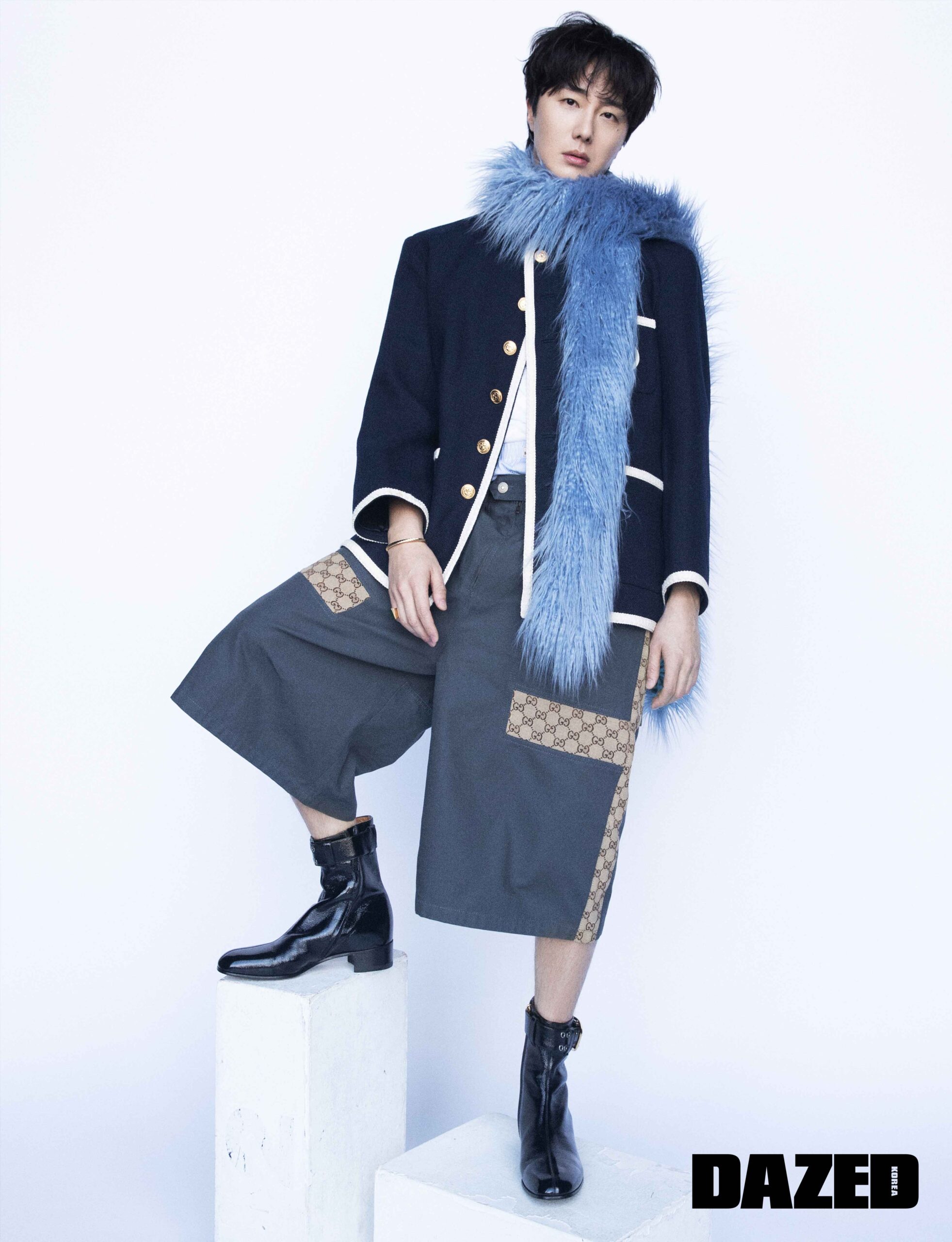 재킷과 팬츠, 드로어즈와 부츠는 모두 구찌(Gucci), 이너로 입은 톱은 오웬스(Rick Owens), 머플러는 클라이드(Clyde), 링과 브레이슬릿은 포트레이트 리포트(Portrait Report).