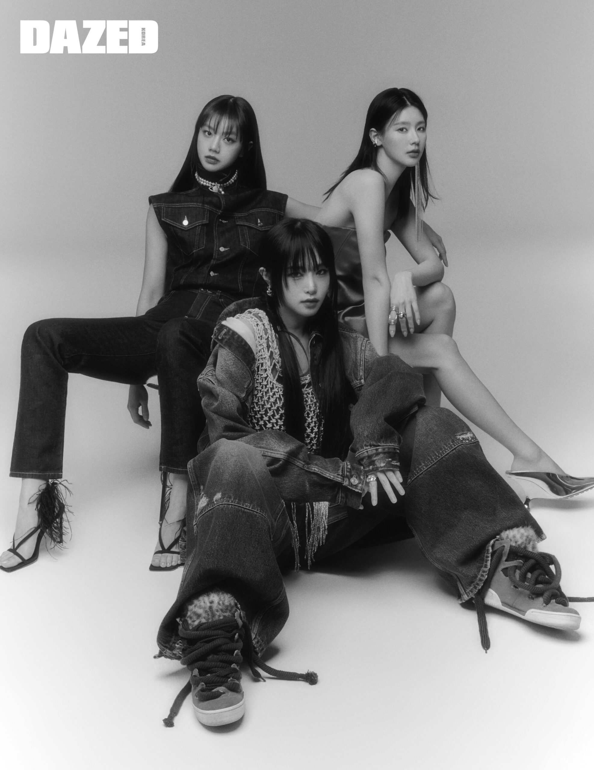 혜리가 입은 데님 보디슈트와 데님 진은 알라이아(ALAÏA), 블랙 깃털 장식 힐은 세르지오 로시(Sergio Rossi), 진주 초커 네크리스와 진주 드롭 네크리스는 비비안 웨스트우드(Vivienne Westwood). 미연이 입은 미니드레스는 프라다(Prada), 스틸레토 힐은 보테가 베네타(Bottega Veneta), 이어링과 이어 커프는 케이비케이(KVK). 예나가 입은 오버사이즈 데님 재킷과 팬츠, 슬리브리스 톱, 이어링은 모두 지방시(Givenchy), 스니커즈는 스타일리스트의 것.
