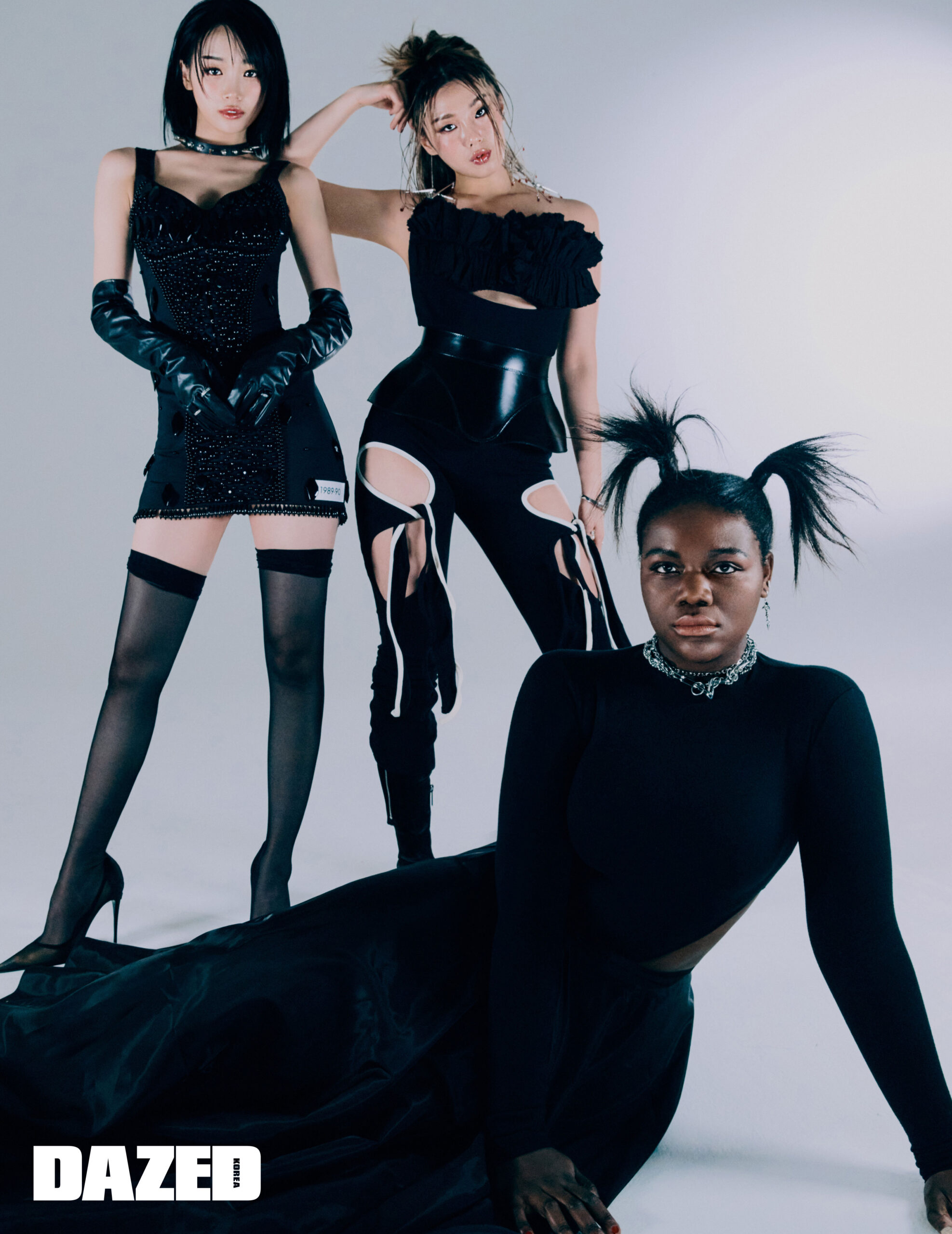 채원이 입은 크리스털 자수 디테일 미니드레스와 사이하이 부츠는 돌체앤가바나(Dolce&Gabbana), 스파이크 초커는 스틸에디션(Steel Edition), 레더 글러브는 에디터의 것. 리정이 입은 톱은 토니 마티체프스키 by 아데쿠베(Toni Maticevski by Adekuver), 컷아웃 디테일 팬츠는 오토링거 by 아데쿠베(Ottolinger by Adekuver), 코르셋은 알렉산더 맥퀸(Alexander McQueen), 부츠는 디젤(Diesel), 이어링은 산쿠안즈(Sankuanz). 파트리샤가 입은 컷아웃 디테일 터틀넥 톱은 탑걸(Topgirl), 롱스커트는 방떼(Venté), 이어링과 스파이크 디테일 실버 네크리스, 실버 체인 네크리스는 모두 스틸에디션(Steel Edition).