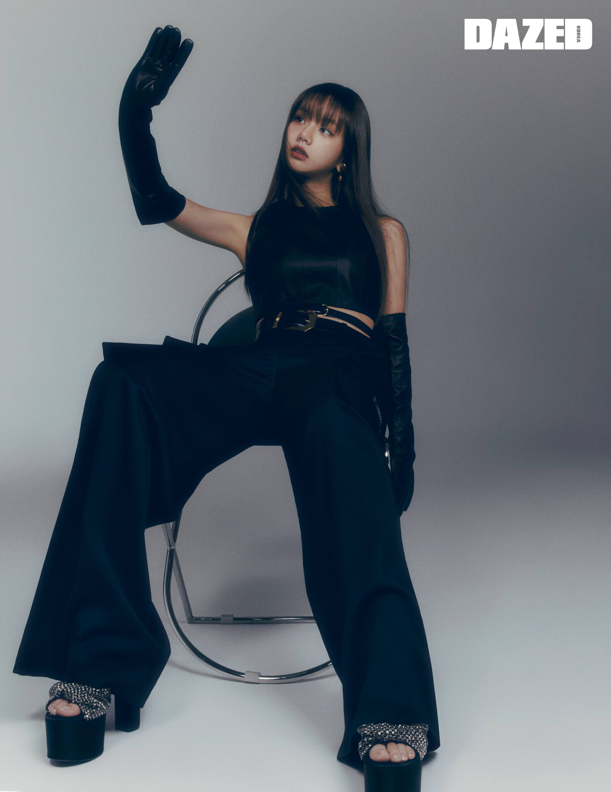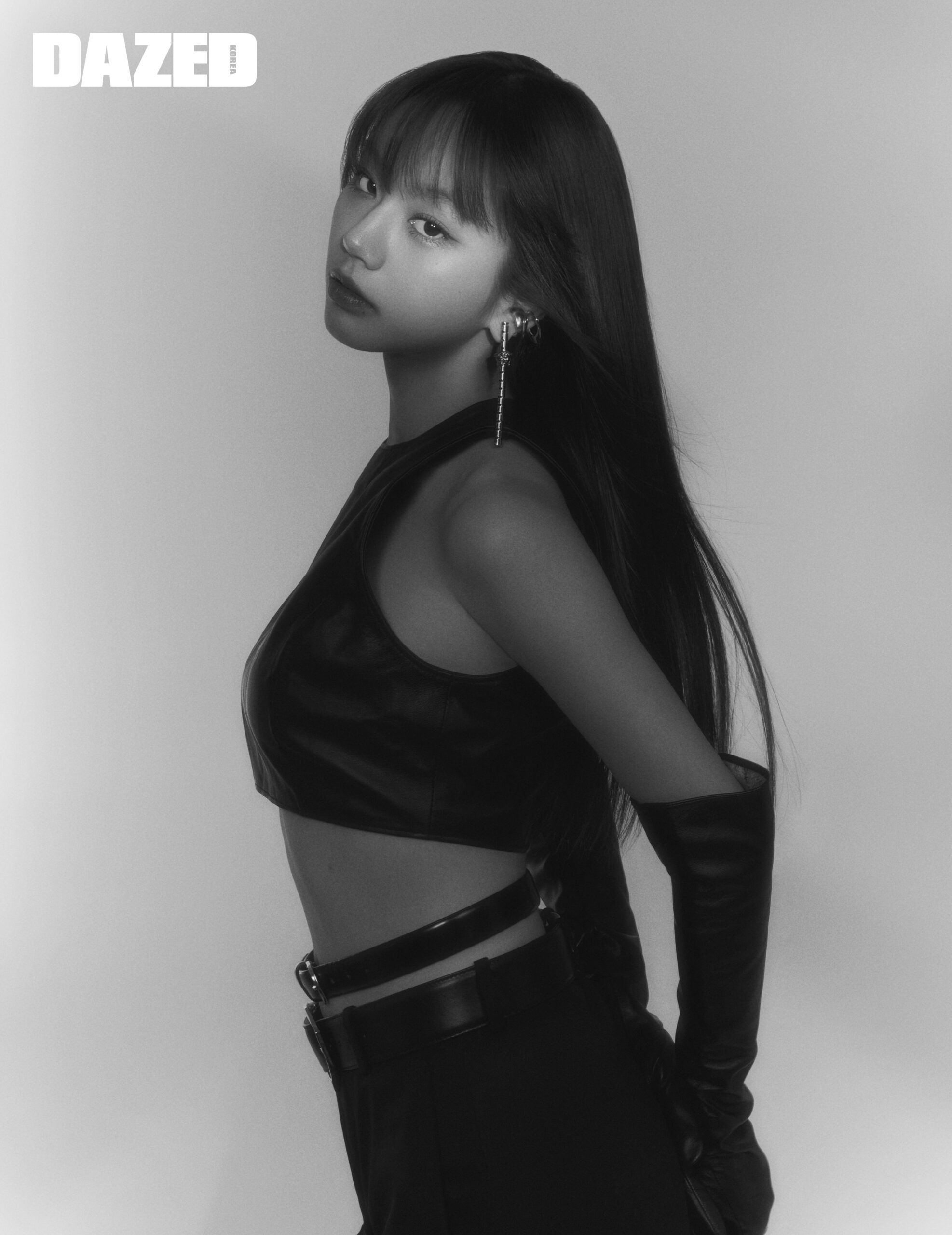 블랙 레더 톱은 8 by 육스(8 by YOOX), 블랙 카고 팬츠와 벨트, 드롭 이어링은 모두 베르사체(Versace), 큐빅 샌들 힐은 세르지오 로시(Sergio Rossi), 골드 이어 커프는 브릴피스(Brill Piece), 레이어링한 블랙 벨트와 롱 레더 글러브는 스타일리스트의 것.