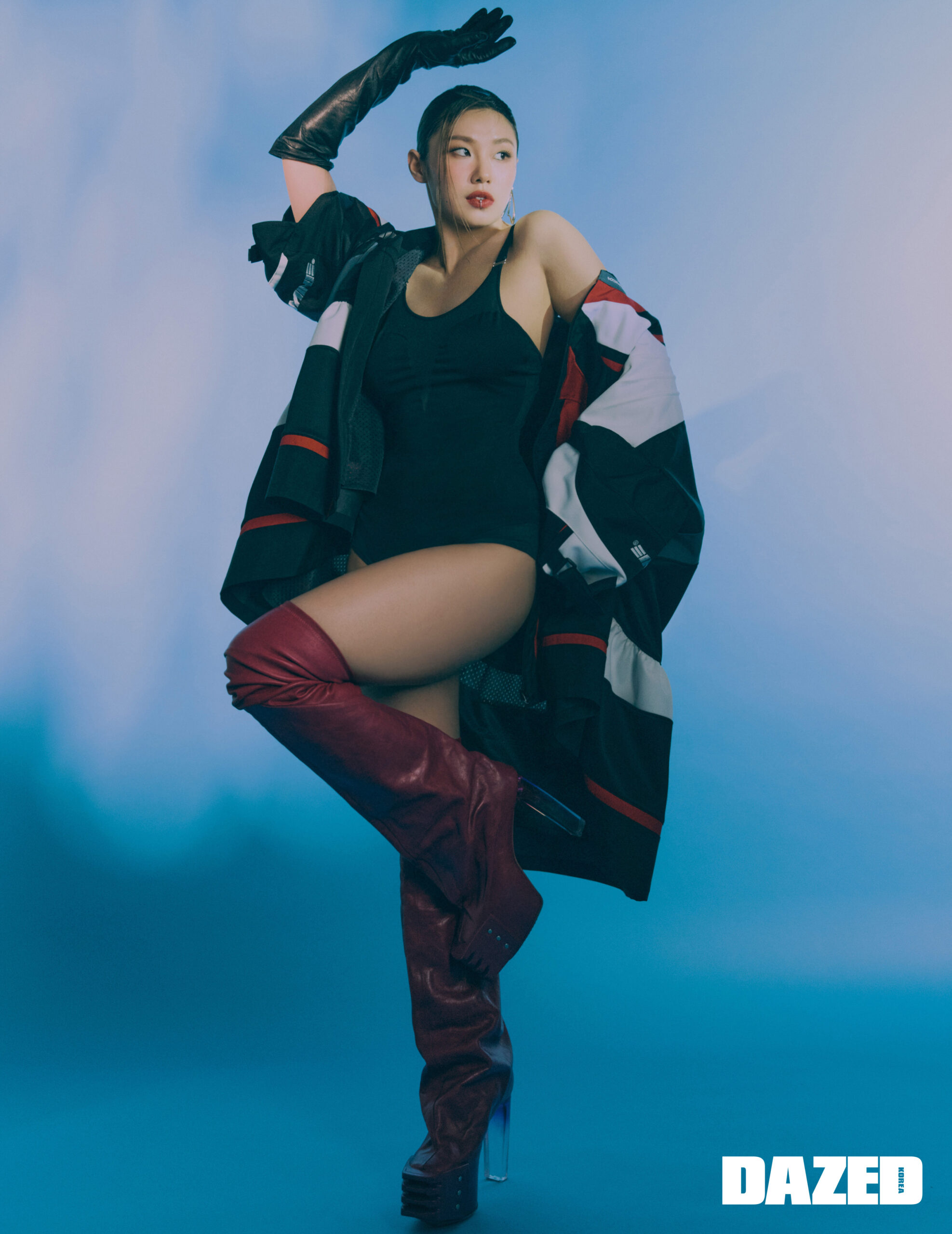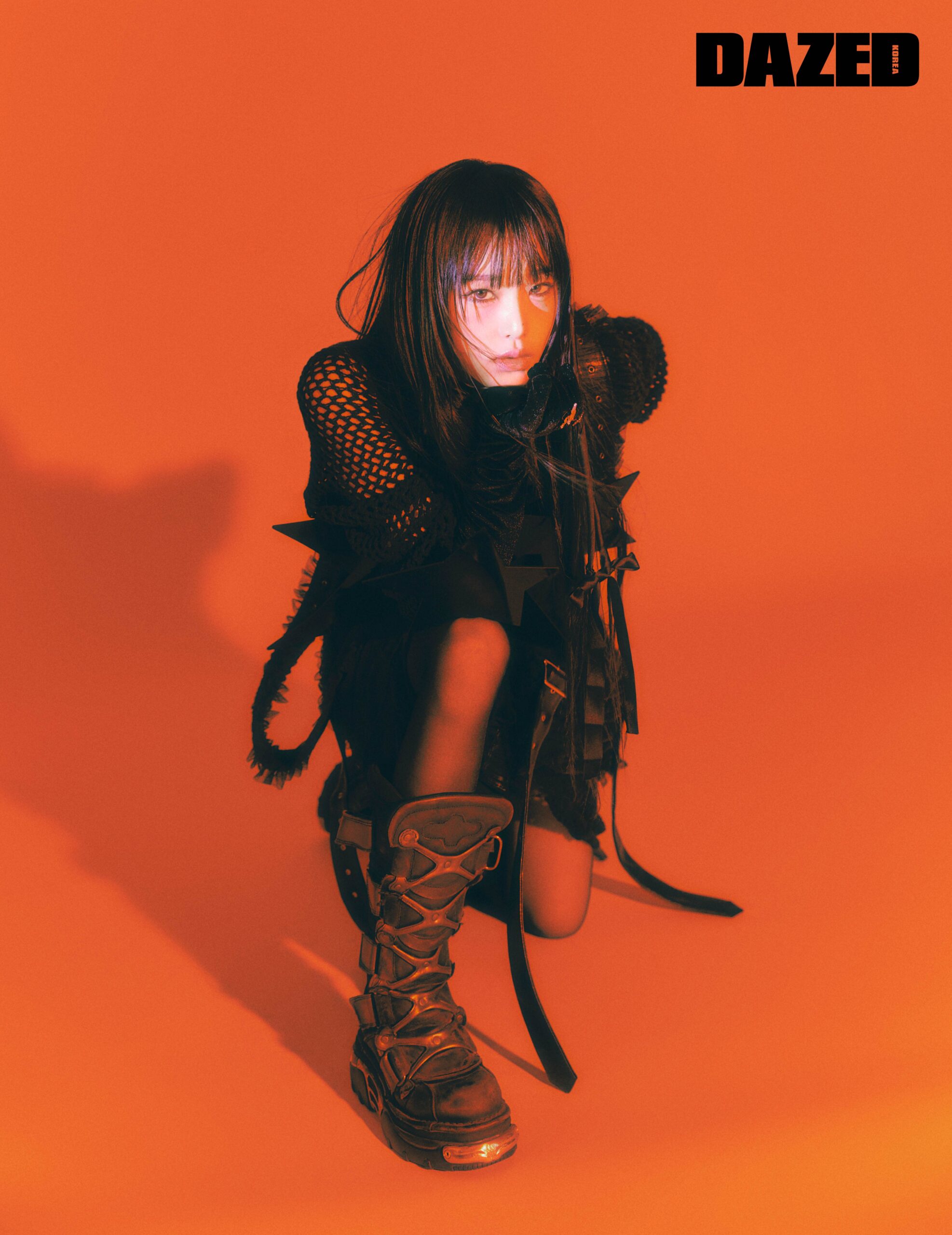플랫폼 사이하이 부츠는 릭 오웬스(Rick Owens), 드롭 이어링은 솔트워터(Saltwater), 블랙 레더 롱 글러브는 스타일리스트의 것.