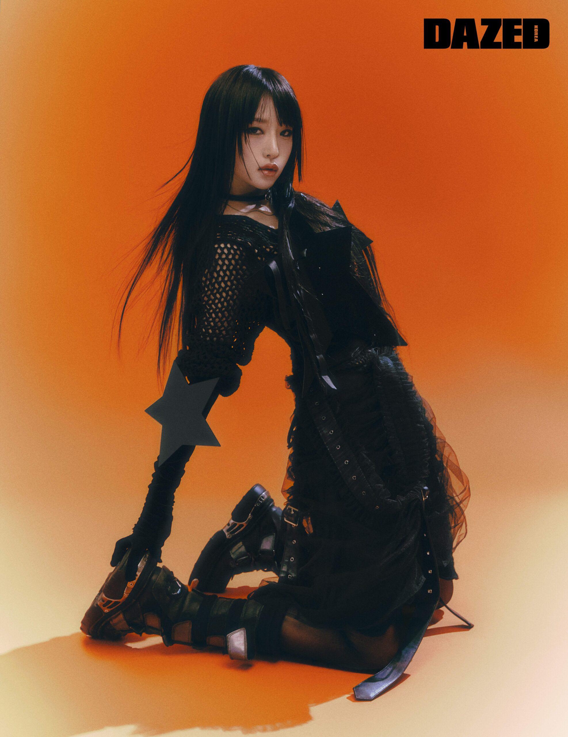 네트 드레스는 육스(Yoox), 튈 스커트는 꼼데가르송(Comme Des Garçons), 별 모티브 뷔스티에와 글러브는 카우기(Kowgi), 네크리스와 부츠, 타이츠는 모두 스타일리스트의 것.