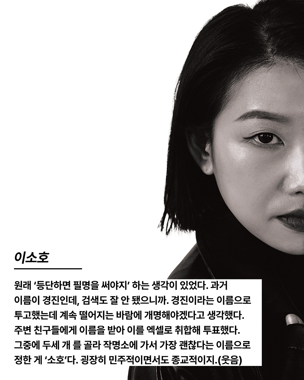 원래 ‘등단하면 필명을 써야지’ 하는 생각이 있었다. 과거 이름이 경진인데, 검 색도 잘 안 됐으니까. 경진이라는 이름으로 투고했는데 계속 떨어지는 바람에 개명해야겠다고 생각했다. 처음엔 작명소에 갔는데, 너무 평범한 이름만 주더라. 주변 친구들에게 이름을 받아 이를 엑셀로 취합해 투표했다. 그중에 두세 개 를 골라 작명소에 가서 가장 괜찮다는 이름으로 정한 게 ‘소호’다. 굉장히 민주적이면서도 종교적이지.(웃음)