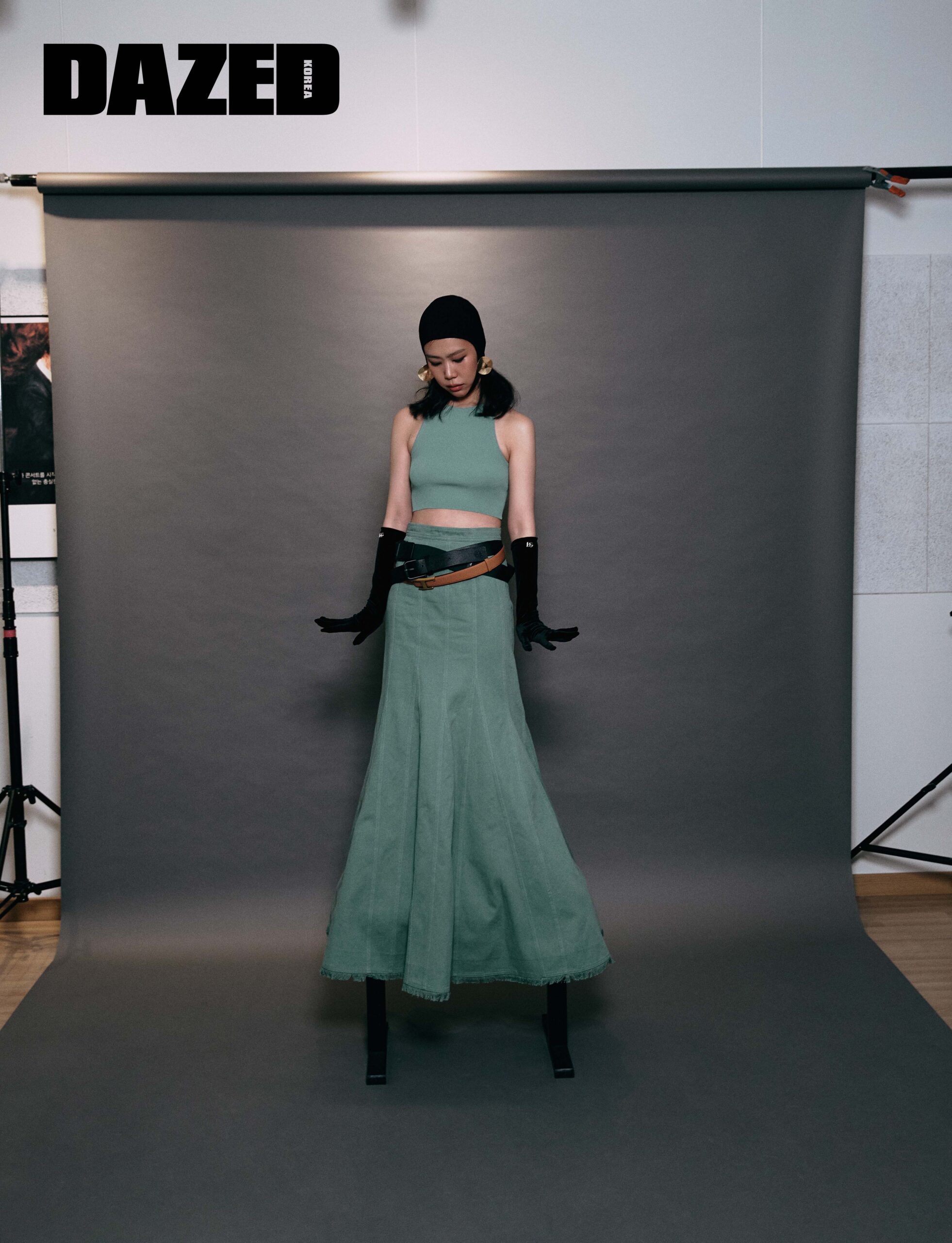 블랙 헤드피스와 그린 톱, 데님 스커트는 모두 막스마라(Max Mara), 이어링은 에이치앤엠(H&M),