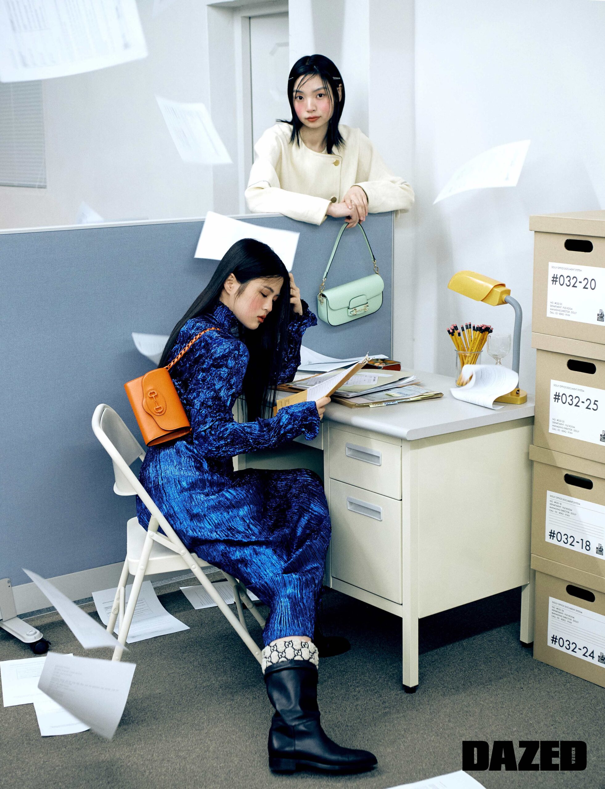 소안이 입은 루렉스 소재의 샤이니 블루 톱과 스커트 셋업, GG 시어링 안감의 레더 부츠, 탈착 가능한 숄더 스트랩이 특징인 구찌 홀스빗 1955 오렌지 레더 미니 숄더백은 모두 구찌(Gucci). 성진이 입은 크레이프 울 소재 재킷과 골드 톤 디테일의 구찌 홀스빗 1955 라이트 그린 레더 숄더백은 구찌(Gucci).