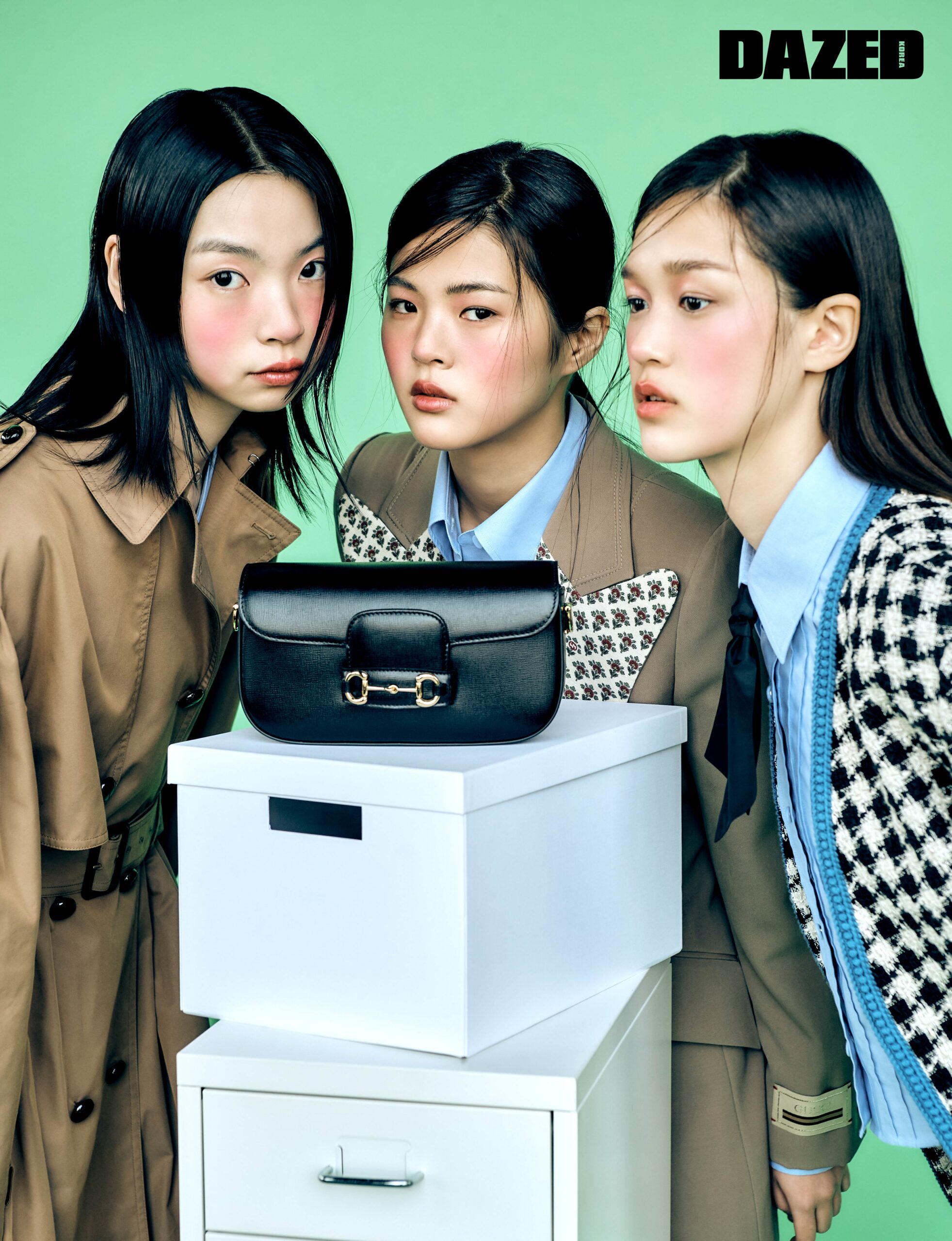 성진이 입은 오버사이즈 더블브레스트 개버딘 트렌치코트는 구찌(Gucci). 소안이 입은 플라워 라펠이 특징인 싱글브레스트 재킷과 팬츠 셋업, 코튼 셔츠는 모두 구찌(Gucci). 수현이 입은 트위드 소재 카디건과 크롭트 코튼 셔츠, 블랙 실크 보타이는 모두 구찌(Gucci). 구찌 홀스빗 1955 블랙 레더 숄더백은 구찌(Gucci).