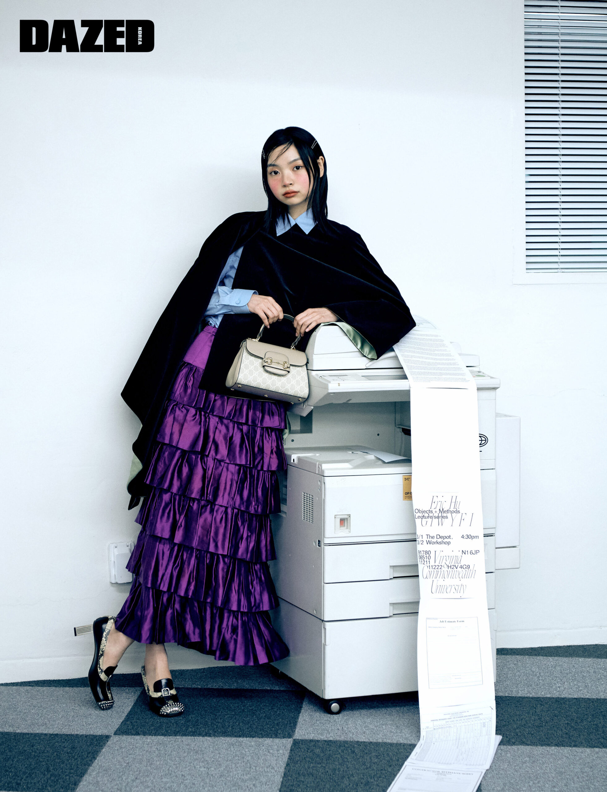 코튼 벨벳 소재의 블랙 케이프와 코튼 셔츠, 러플이 돋보이는 새틴 소재 퍼플 스커트, 스파이크 토캡이 특징인 파이톤 힐 모카신, 베이지 & 화이트 컬러의 구찌 1955 홀스빗 스몰 톱 핸들 백은 모두 구찌(Gucci).