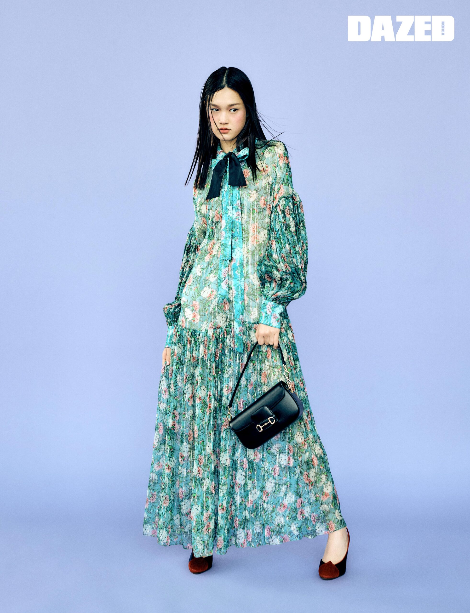 아콰마린 실크 크레퐁 소재의 플로럴 프린트 드레스와 레드 토가 특징인 슬링백 힐, 블랙 실크 보타이, 골드 홀스빗 장식이 돋보이는 구찌 홀스빗 1955 블랙 레더 숄더백은 모두 구찌(Gucci).