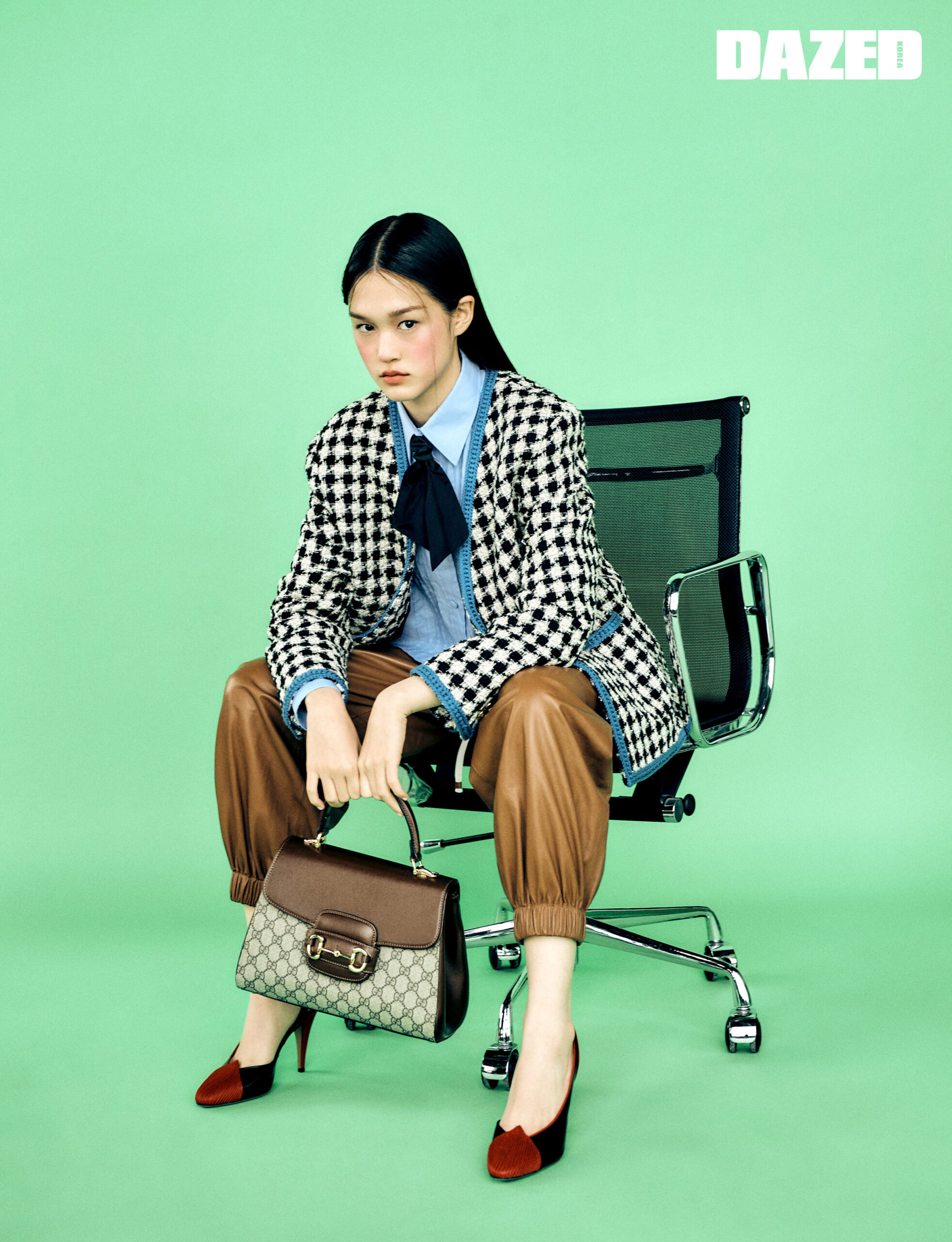 트위드 소재 카디건과 크롭트 코튼 셔츠, 브라운 레더 팬츠, 블랙 실크 보타이, 레드 토가 돋보이는 슬링백 힐, GG 수프림 캔버스가 특징인 구찌 홀스빗 1955 미디엄 톱 핸들 백은 모두 구찌(Gucci).
