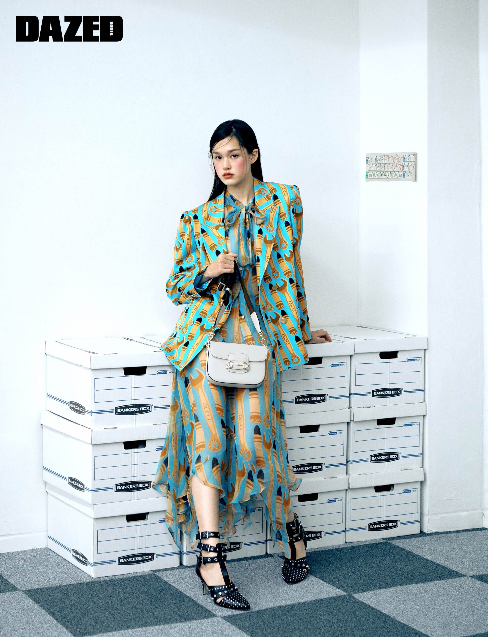 독특한 패턴이 특징의 더블 재킷과 슬리브리스 셔츠, 스커트, 스터드 장식이 특징인 힐, 구찌 홀스빗 1955 화이트 레더 미니 숄더백은 모두 구찌(Gucci).