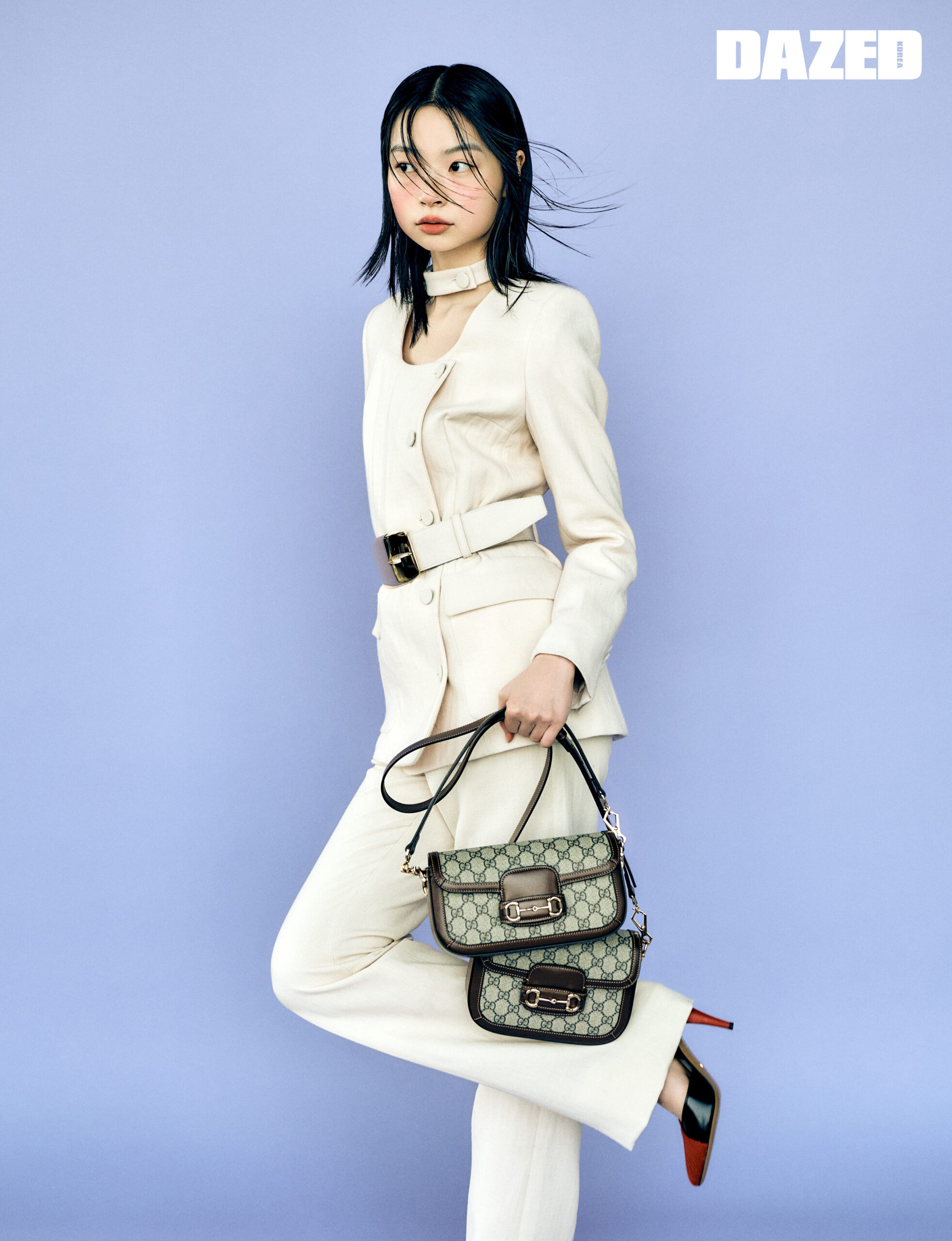 버클 장식 벨트가 돋보이는 크레페 울 소재 재킷과 팬츠 셋업, 레드 토 슬링백 힐, GG 수프림 캔버스가 특징인 구찌 홀스빗 1955 숄더백, 구찌 홀스빗 1955 미니 숄더백은 모두 구찌(Gucci).