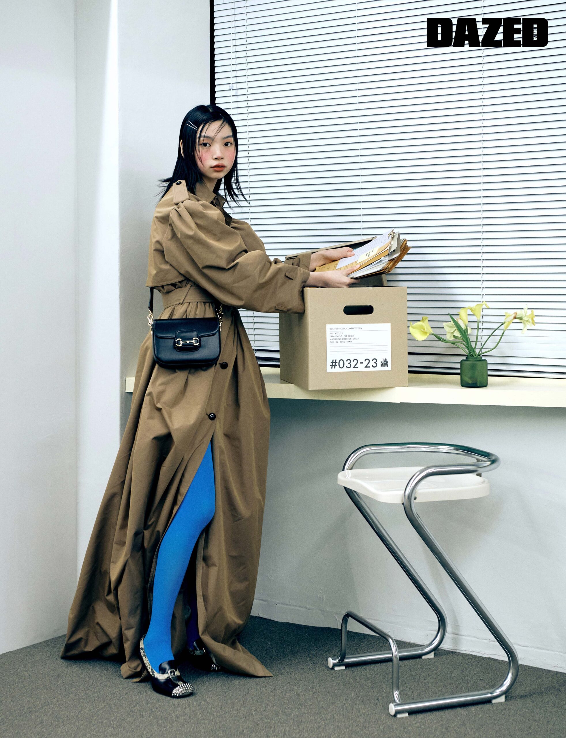 오버사이즈의 캐멀 컬러 개버딘 더블브레스트 트렌치코트와 스파이크 토캡의 파이톤 힐 모카신, 블루 타이츠, 구찌 홀스빗 1955 블랙 레더 미니 숄더백은 모두 구찌(Gucci).
