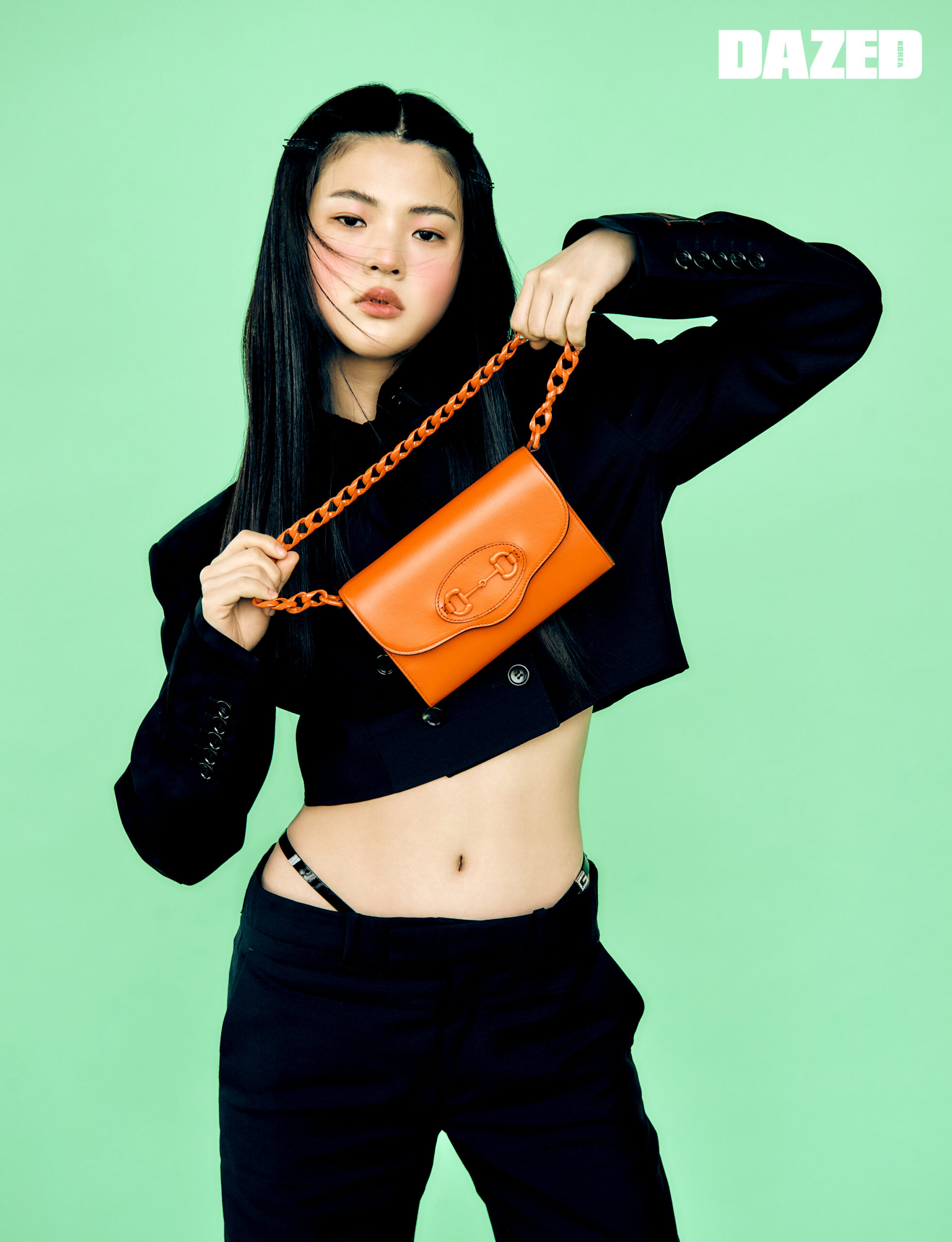 더블 크롭트 재킷과 코튼 셔츠, 로웨이스트 스트레이트 핏 팬츠, 탈착 가능한 숄더 스트랩이 달린 구찌 홀스빗 1955 오렌지 레더 미니 숄더백은 모두 구찌(Gucci).