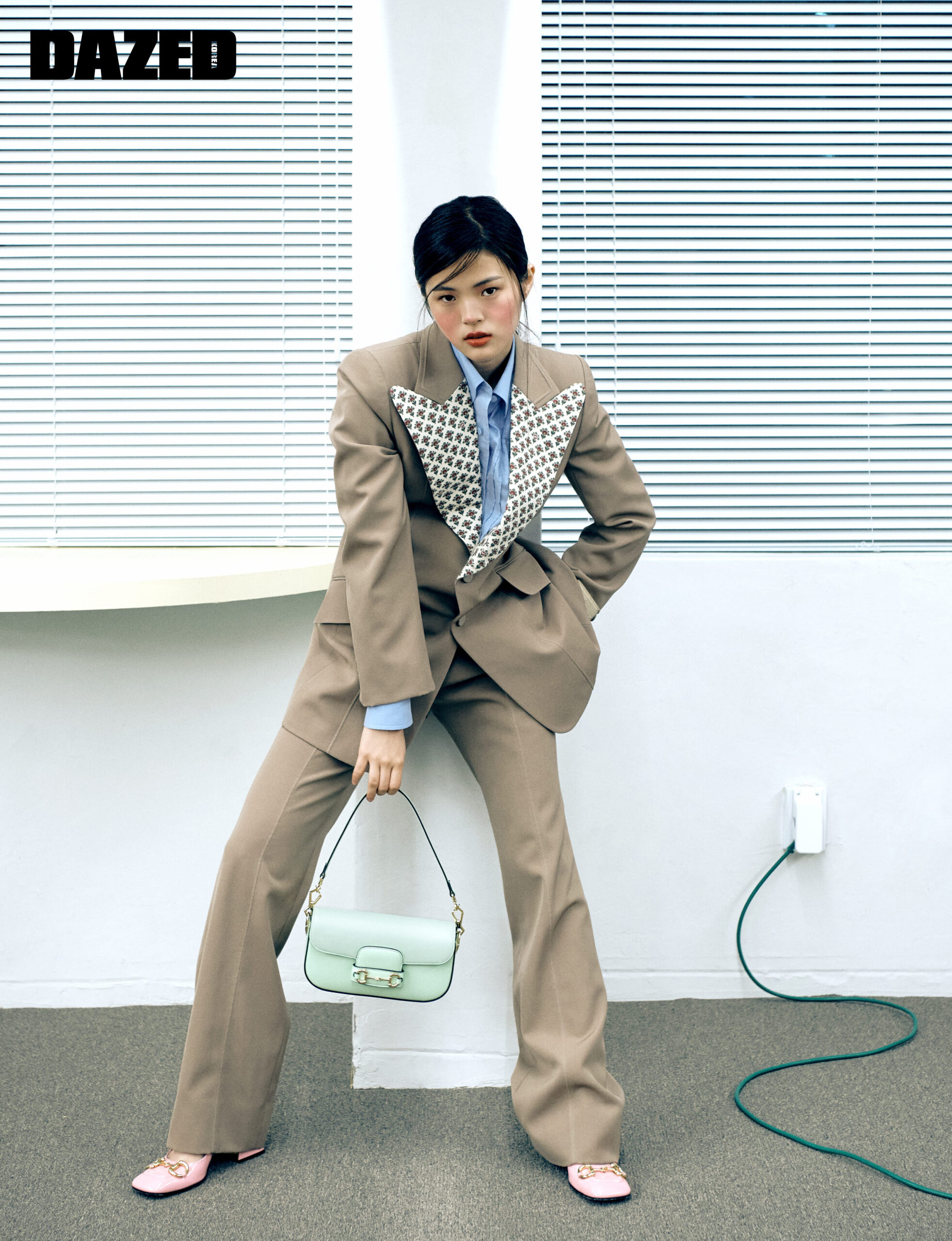 플라워 라펠의 싱글브레스트 재킷과 팬츠 셋업, 코튼 셔츠, 골드 홀스빗 장식의 스퀘어 토 펌프스, 구찌 홀스빗 1955 라이트 그린 레더 숄더백 모두 구찌(Gucci).