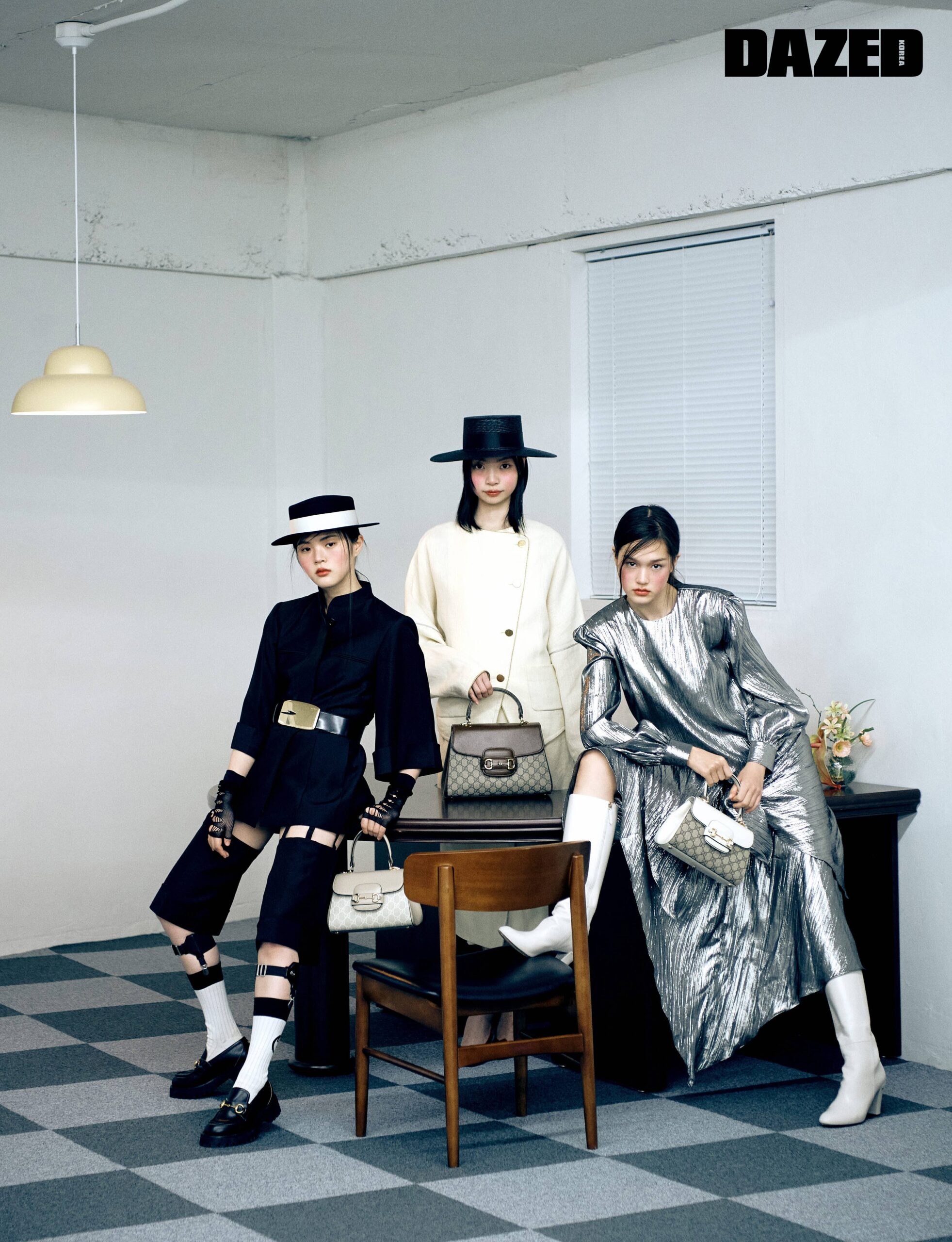 소안이 입은 만다린 칼라 디테일의 블랙 싱글브레스트 재킷과 가터 디테일이 돋보이는 버뮤다팬츠, 레더 로퍼, 화이트 스트랩이 돋보이는 페도라, 블랙 핑거리스 글러브, G 버클 웨이스트 벨트, 레더 삭스 서스펜더, G 로고 화이트 삭스, 베이지 & 화이트 구찌 홀스빗 1955 스몰 톱 핸들 백은 모두 구찌(Gucci). 성진이 입은 크레이프 울 소재 재킷과 스커트 셋업, 레드 토가 특징인 슬링백 힐, 블랙 파나마 해트, GG 수프림 캔버스가 특징인 구찌 홀스빗 1955 미디엄 톱 핸들 백 모두 구찌(Gucci). 수현이 입은 루렉스 소재의 실버 드레스와 화이트 레더 힐 부츠, 구찌 홀스빗 1955 스몰 톱 핸들 백은 모두 구찌(Gucci).