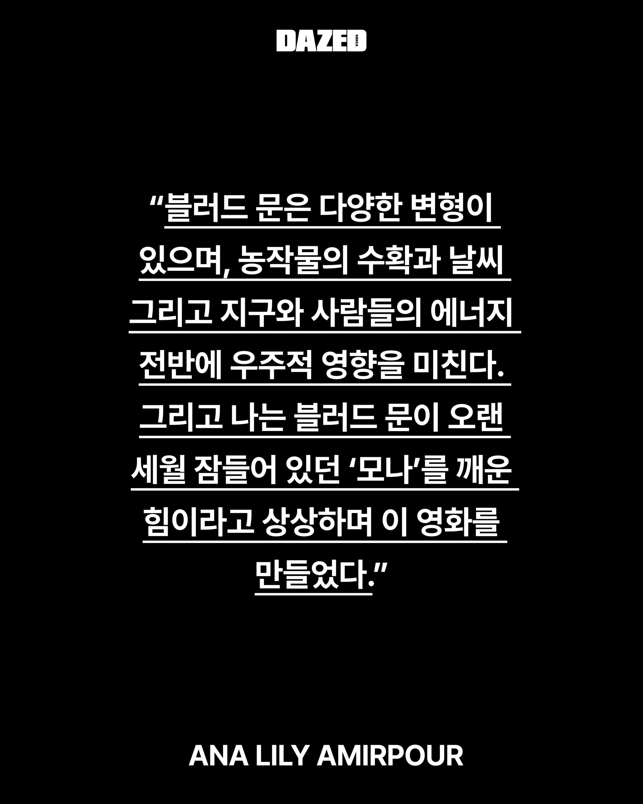 영화를 쓰기 시작할 때 늑대 인간 신화를 떠올렸다. 늑대 인간이 등장하는 영화에서 초자연적 현상들은 모두 달과 연관되어 있다. 하지만 나는 조금 더 원초적이고 여성적인 분위기로 이 영화에 접근하고 싶었다. 왜냐하면 여성들이 매달 생리를하는 것이 달과 무척 연관되어 있다는 느낌을 받았기 때문이다. 달이 바닷물의 조수에 관여하는 것처럼 난소와 난자가 비슷한 관계를 이룬다고 생각했다. 이것은 가장 원초적 형태의 마법이자 지구상에서 가장 강력한 힘이다. 블러드 문은 다양한 변형이 있으며, 농작물의 수확과 날씨 그리고 지구와 사람들의 에너지 전반에 우주적 영향을 미친다. 그리고 나는 이 블러드 문이 오랜 세월 잠들어 있던 모나를 깨운 힘이라고 상상하며 이 영화를 만들었다. 사람들이 달이 정확히 어떤 원리로 움직이는지 이해하지 못하는 것처럼 관객들도 모나를 정확히 이해할 수 없다. 영화 속 마법이란 바로 그런 것이다. 정확히 설명하기 어려운 마술 같은 것.