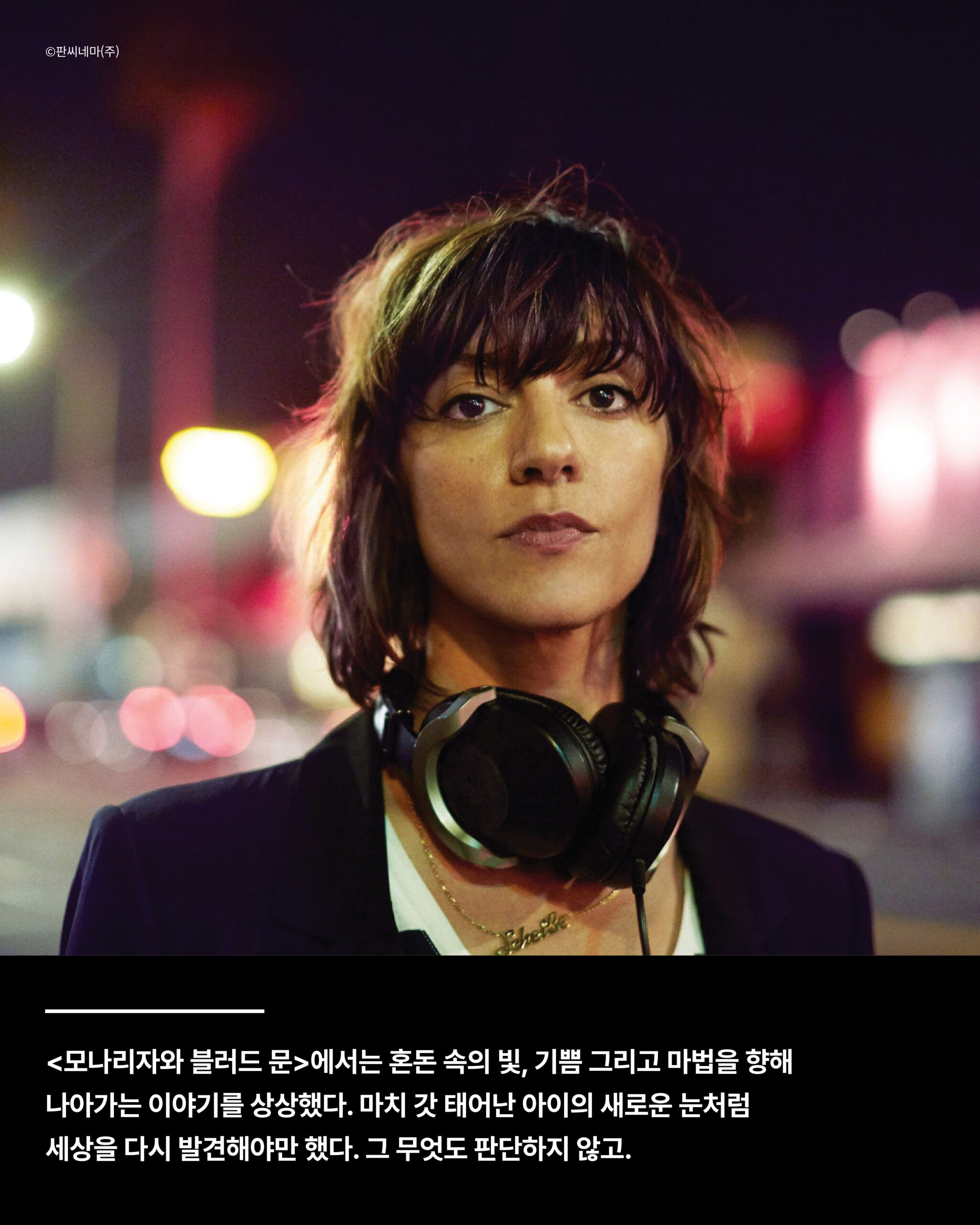 내 두 번째 영화 에서 나는 인간 본성의 어두운 면에 대해 다뤘다. 미국의 문명이 심하게 파괴되고 기형화되어서 사람들이 서로를 적으로 간주하는 사회를 상상했다. 에서는 혼돈 속의 빛, 기쁨 그리고 마법을 향해 나아가는 이야기를 상상했다. 마치 갓 태어난 아이의 새로운 눈처럼 세상을 다시 발견해야만 했다. 그 무엇도 판단하지 않고. 그래서 모나는 완벽한 속박 상태에서 태어난다. 이 세상은 그를 거부하고 상처를 주었을지도 모른다. 하지만 그는 여전히 모든 것에 열려 있다. 나는 그가 신비한 힘을 갖길 바랐다. 초자연적 힘을 상상하는 것은 캐릭터를 만드는 즐거움 중 하나다. 필요하다면 누구든 물리적으로 조종할 수 있는 모나의 능력은 내가 갖고 싶은 이상적인 능력이다. 이 능력 덕분에 모나는 두려움 없이 걸어 다닐 수 있다. 가장 어두운 골목길을 걸을 수 있고, 가장 위험한 사람들과도 대화할 수 있고, 그들을 육체적으로 통제할 수도 있다. 이 능력은 나쁜 행성 지구에 사는 소녀에게 궁극의 자유를 제공한다. 우리는 느낄 수 없는 자유를. 일반인들은 특정한 두려움을 물려받아서 죽을 때까지 그걸 지니고 살아간다. 하지만 만약 당신이 어떤 결정을 내려야 할 때 그런 두려움을 갖지 않아도 된다면 어떤 것들을 발견하고 탐험할 수 있을지 상상해 본 적이 있는가? 마치 꿈만 같은 일이다.